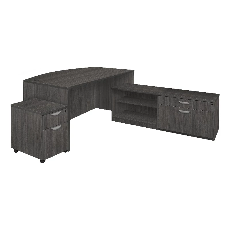 The Legacy Hi-Low L-Desk is a modern twist on a corner desk. It comes with a low credenza instead of a traditional return. The 20-inch high low lateral file has a box drawer and a file drawer that accepts both letter and legal filing. This unique desk also includes a mobile two-drawer pedestal with locking wheels that can be placed anywhere. All drawers lock and include ergonomically shaped black drawer pulls. Also standing at 20-inches high, the open storage cabinet has one adjustable shelf that can be moved in 1-inch increments. The low credenza is a perfect height to slide underneath the desk to save space. It can also be positioned on either side of the desk to accommodate both left and right handed individuals. The main desk measures 71-inches long and offers an extra wide work surface with an executive bow front so there is plenty of room to spread out, allowing you to multi-task and efficiently manage large work loads. Strategic grommeting keeps your work area looking clean and desktops cable and clutter free. Adjustable glides on the bottom of the base keep the desktop level and are easy to adjust. Finished in an stylish Ash Grey laminate, this desk coordinates with other Legacy furniture, which makes customizing easy. The Legacy collection is constructed of a 1-inch thick thermal fused melamine laminate with a 3-millimeter commercial grade matching PVC edge. Laminates are scratch, stain and scald resistant. Legacy casegoods are backed by a 10-year limited manufacturer’s warranty.