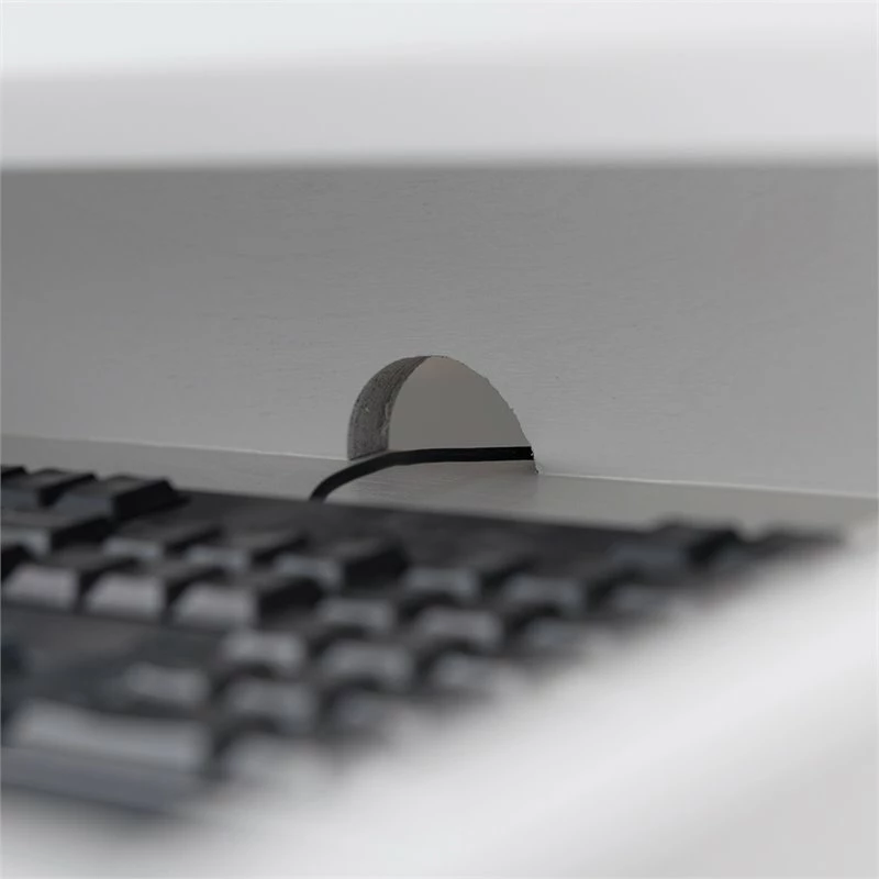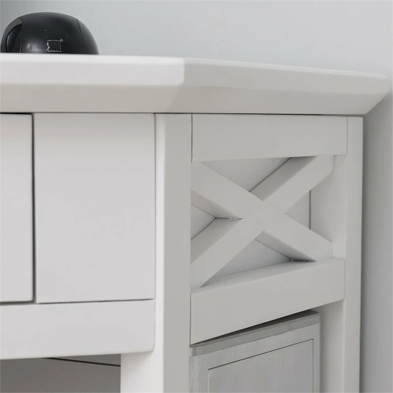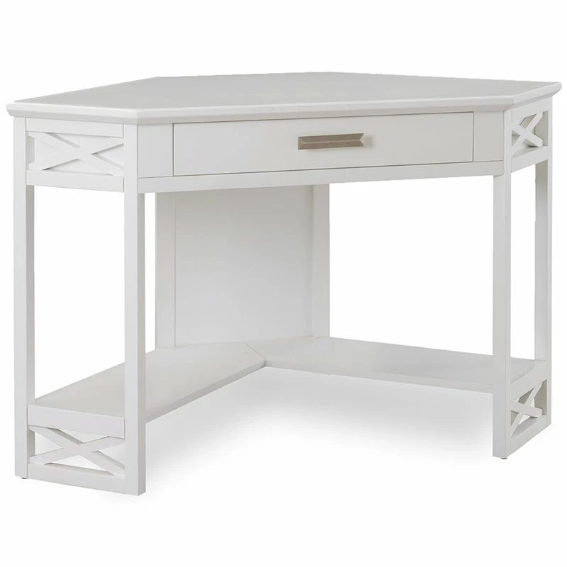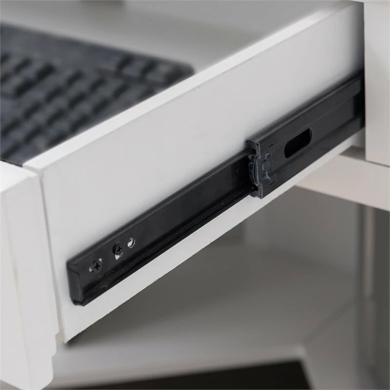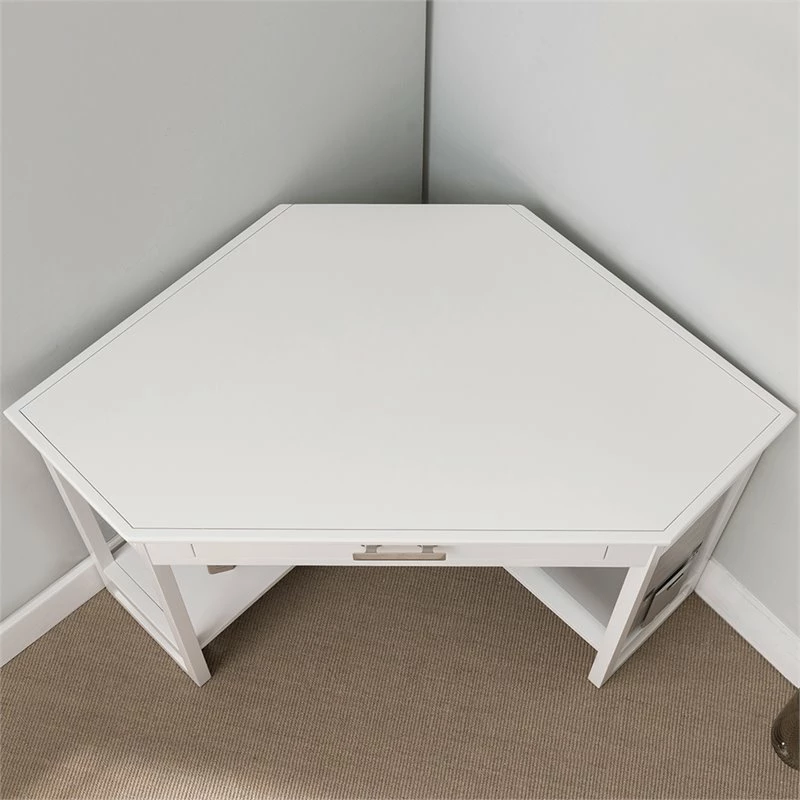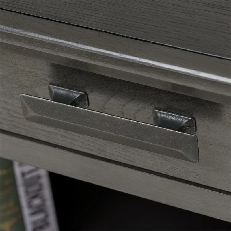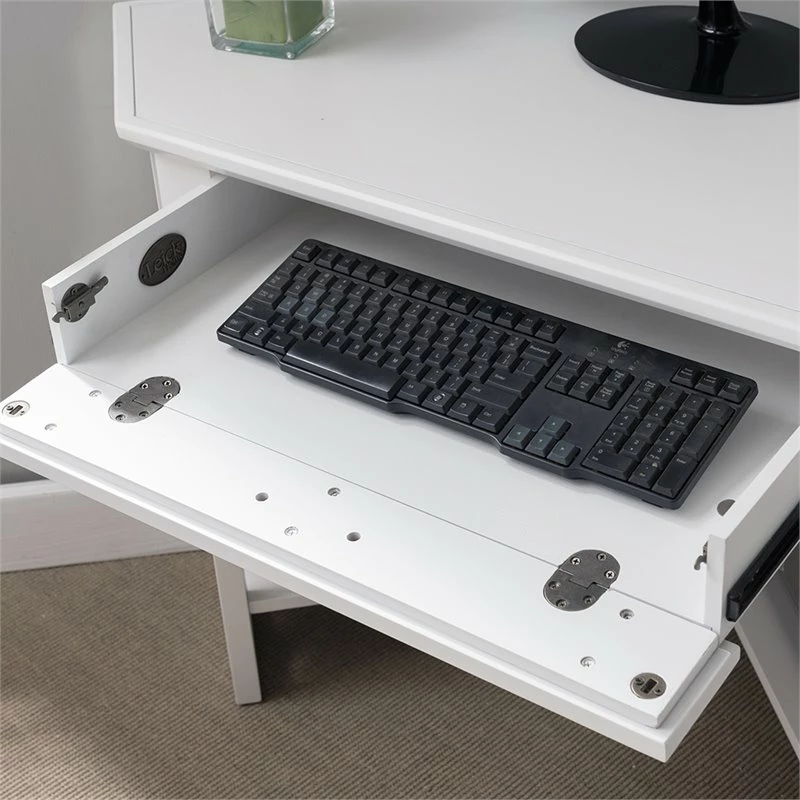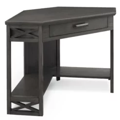 Sturdily built of real oak lumber and finished in a natty, Smoke Gray this desk combines fashionable form with full function. Perfect for laptops or to hide away papers or a desktop keyboard, this efficiently scaled desk offers abundant organization assistance nestled into the corner of the room. The drop down front hides the keyboard at a comfortable work height while full extension drawer guides offer the full depth of the drawer as useable space.