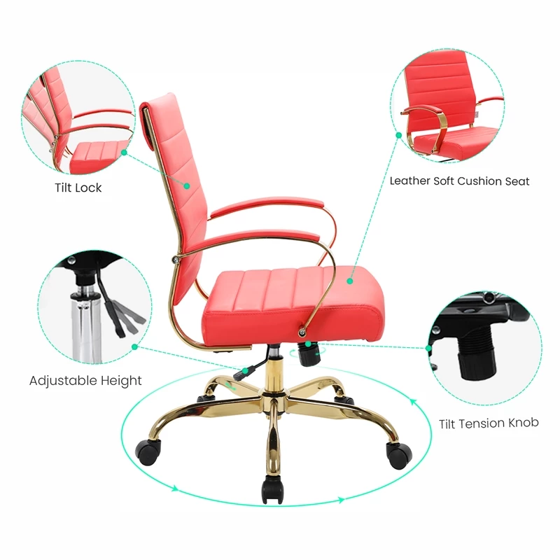 Embrace full luxury with this exceptional Gold FrameBenmar office chair built to provide optimal comfort and a sophisticated aesthetic. Make a statement with an adjustable mid-century style chair that completes the contemporary office space. Inspired by a classic mid-century design, this version shows off a bold and sophisticated presence. With a pneumatic gas lift to adjust the seat height and 360-degree swivel, this chair delivers the versatility and functionality required by the modern working environment. A tension knob and tilt locking lever complement a catered five-point base for easy mobility.