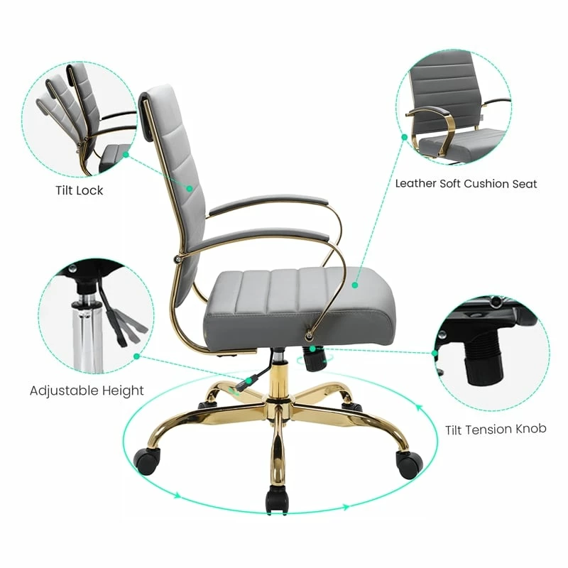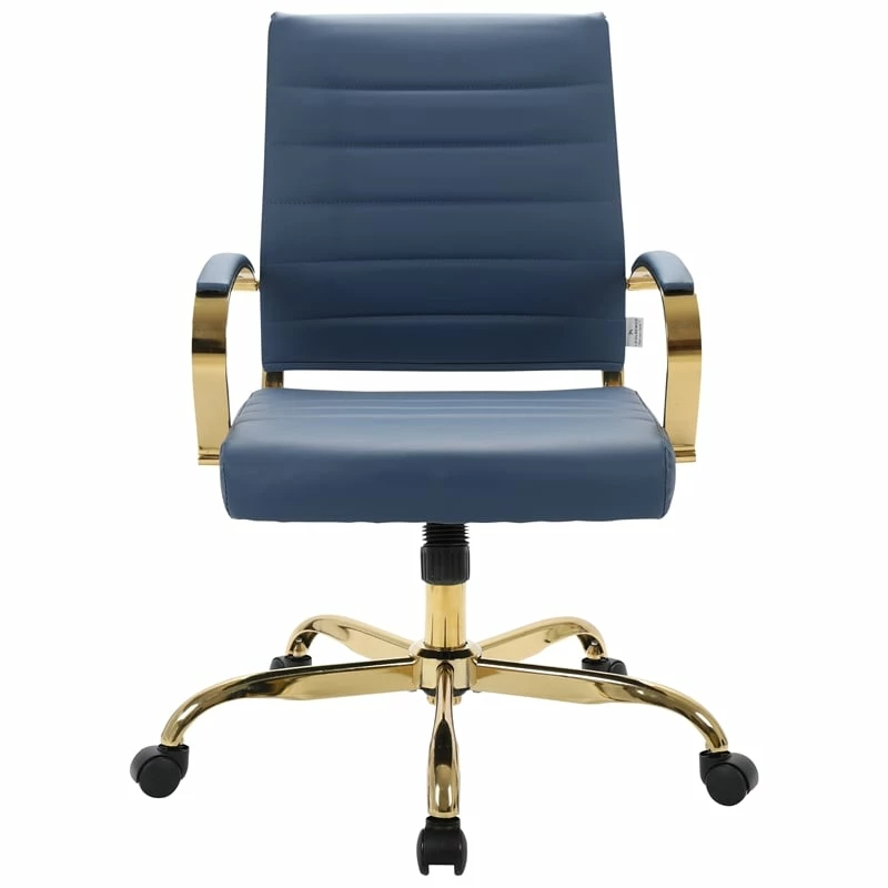 Embrace full luxury with this exceptional Gold FrameBenmar office chair built to provide optimal comfort and a sophisticated aesthetic. Make a statement with an adjustable mid-century style chair that completes the contemporary office space. Inspired by a classic mid-century design, this version shows off a bold and sophisticated presence. With a pneumatic gas lift to adjust the seat height and 360-degree swivel, this chair delivers the versatility and functionality required by the modern working environment. A tension knob and tilt locking lever complement a catered five-point base for easy mobility.