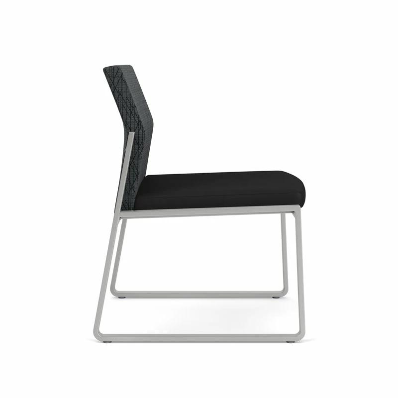 The Gansett Armless Guest Chair is sleek yet sturdy. Gansett will impress from any angle with its distinctive sled base frame and thoughtfully contoured backrest that radiate comfort and sophistication. Features include sturdy steel construction, durable powder coat finish, and a comfortable Matrex seat support system. Available in stain-resistant solid fabric, alluring designer fabric, and easy-clean, heavy-duty vinyl and polyurethane upholstery options. 300 lb weight capacity.
