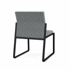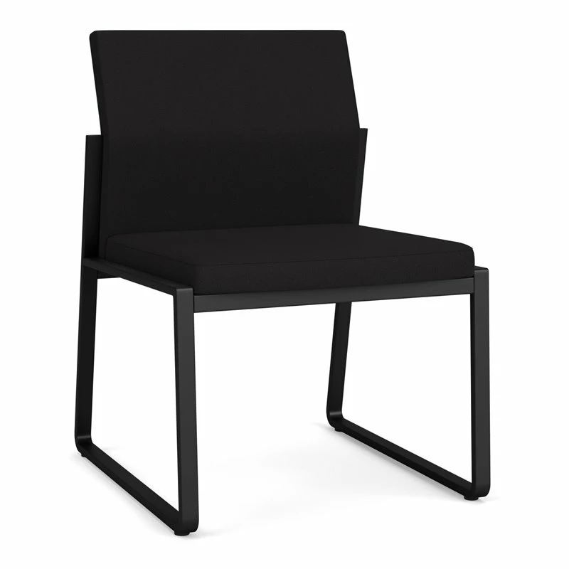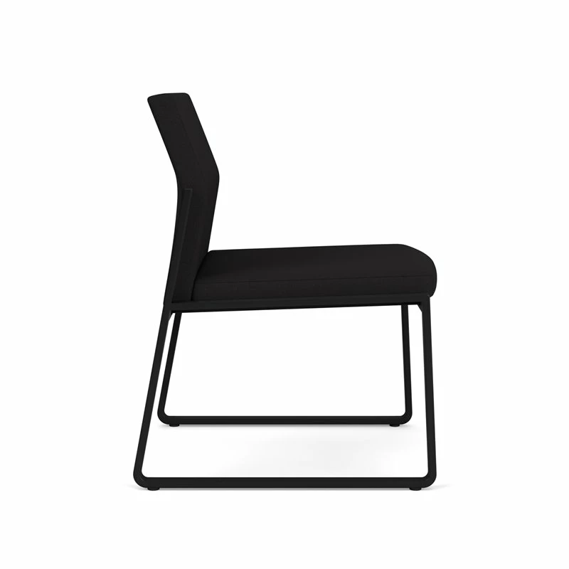 The Gansett Armless Guest Chair is sleek yet sturdy. Gansett will impress from any angle with its distinctive sled base frame and thoughtfully contoured backrest that radiate comfort and sophistication. Features include sturdy steel construction, durable powder coat finish, and a comfortable Matrex seat support system. Available in stain-resistant solid fabric, alluring designer fabric, and easy-clean, heavy-duty vinyl and polyurethane upholstery options. 300 lb weight capacity.