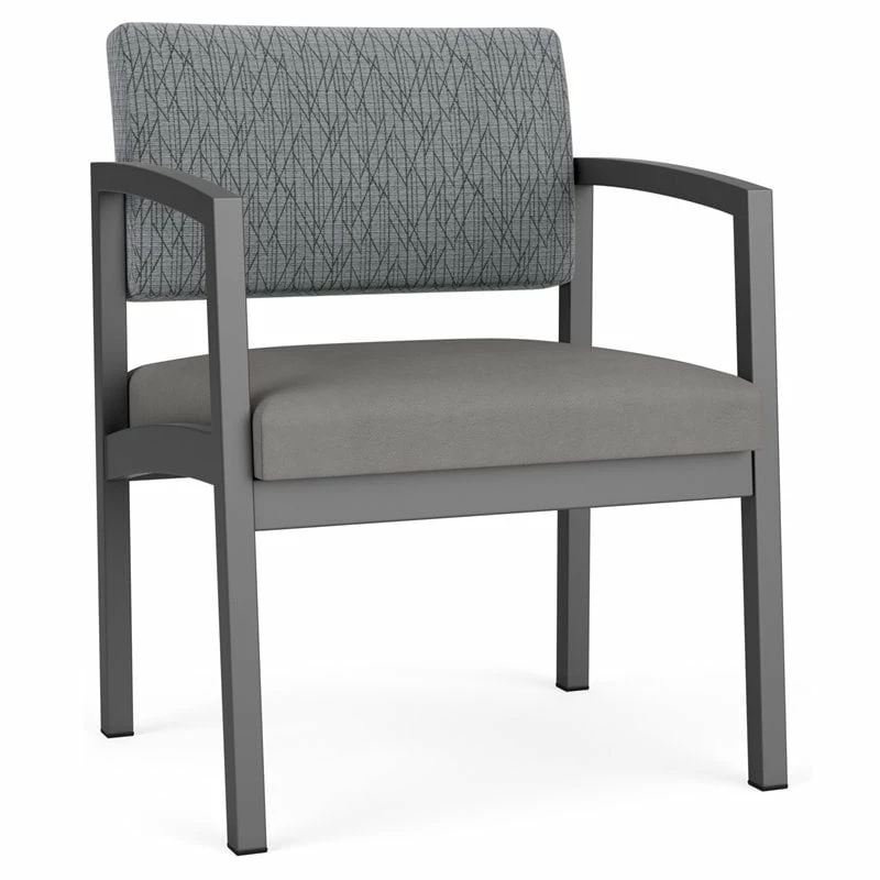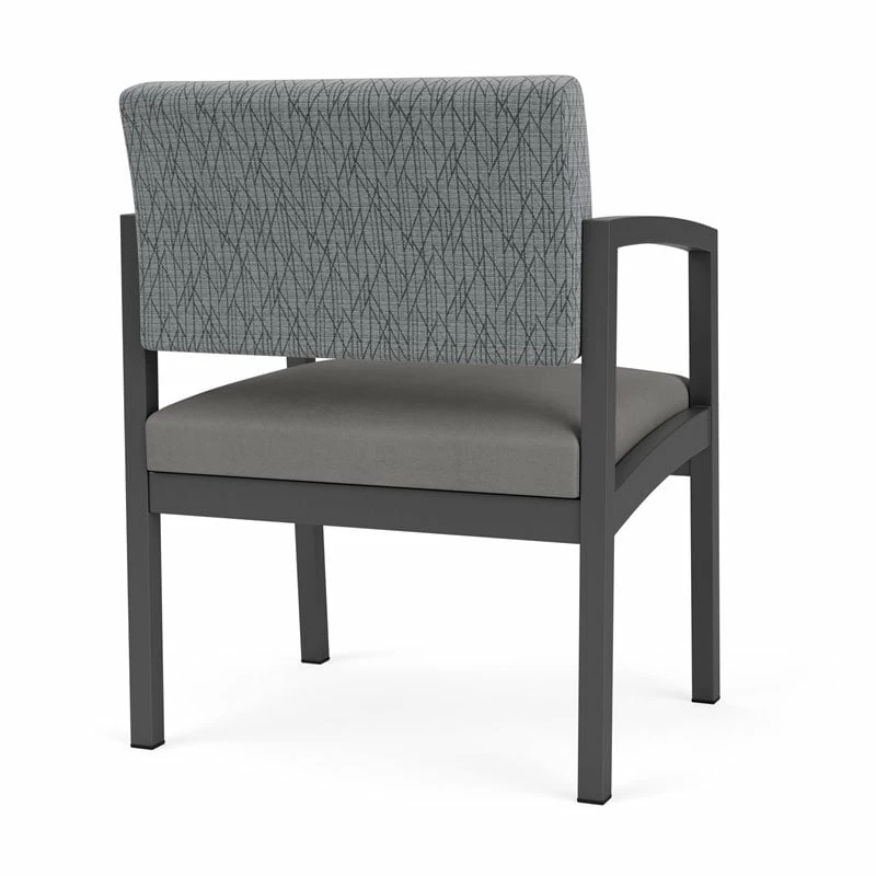 The Lenox Steel oversize guest chair with its graceful transitional styling, gently sloped arm design, and upholstered seat and back cushions will give your space a light, airy look. Features include sturdy steel construction, durable powder coat finish, and a comfortable Matrex seat support system. Available in stain-resistant solid fabric, alluring designer fabric, and easy-clean, heavy-duty vinyl and polyurethane upholstery options. 400 lb weight capacity.