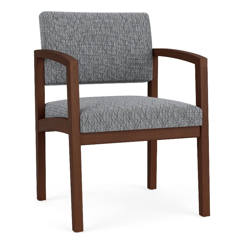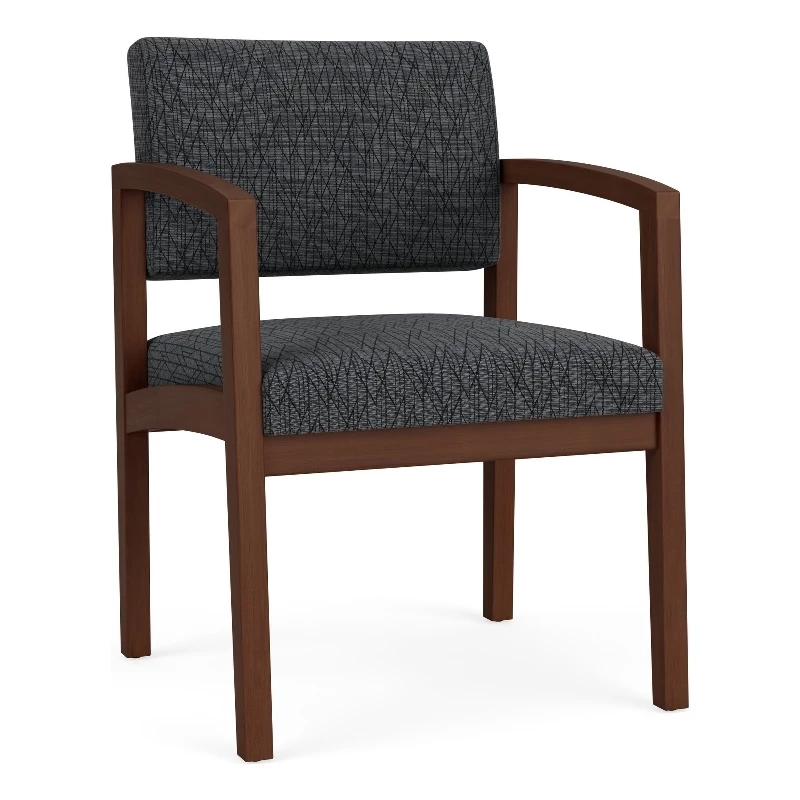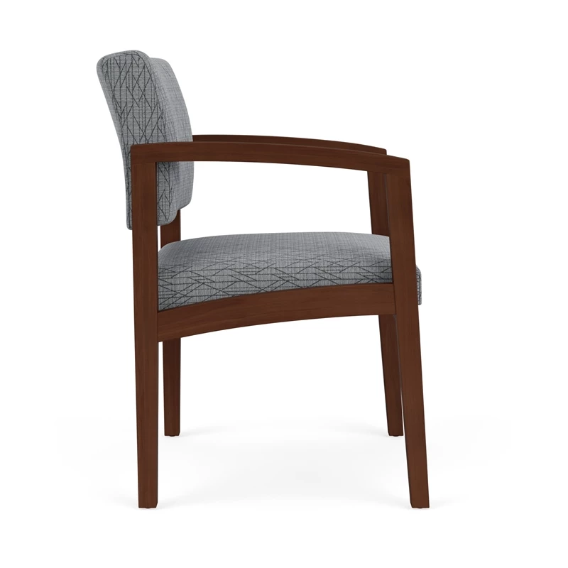 The Lenox Wood guest chair with its graceful transitional styling, gently sloped arm design, and upholstered seat and back cushions will give your space a light, airy look. Features include sturdy hardwood construction, durable lacquer finish, and a comfortable Matrex seat support system. Available in stain-resistant solid fabric, alluring designer fabric, and easy-clean, heavy-duty vinyl and polyurethane upholstery options.