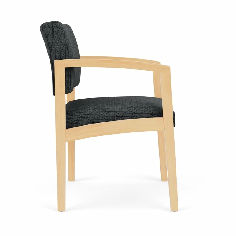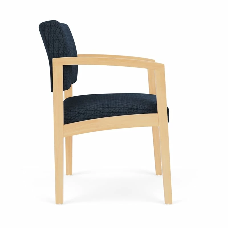 The Lenox Wood guest chair with its graceful transitional styling, gently sloped arm design, and upholstered seat and back cushions will give your space a light, airy look. Features include sturdy hardwood construction, durable lacquer finish, and a comfortable Matrex seat support system. Available in stain-resistant solid fabric, alluring designer fabric, and easy-clean, heavy-duty vinyl and polyurethane upholstery options.