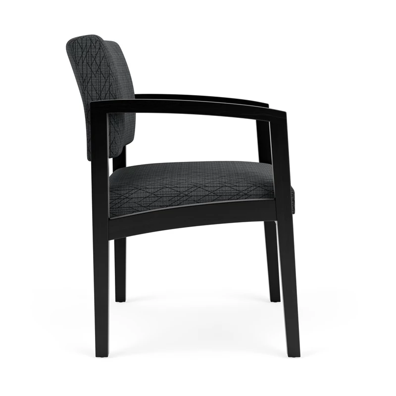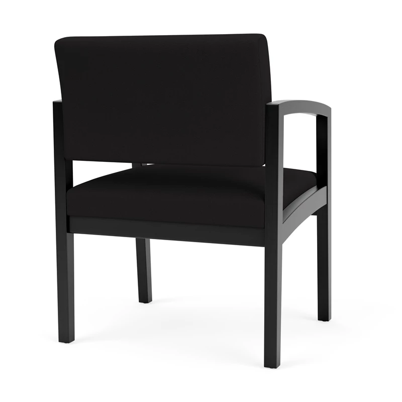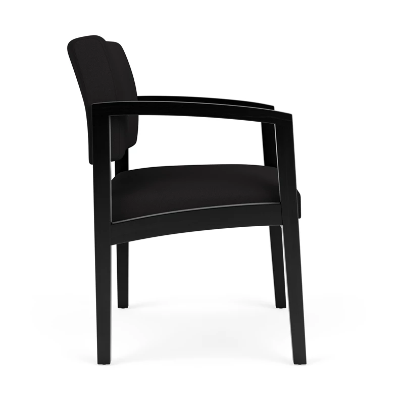 The Lenox Wood oversize guest chair with its graceful transitional styling, gently sloped arm design, and upholstered seat and back cushions will give your space a light, airy look. Features include sturdy hardwood construction, durable lacquer finish, and a comfortable Matrex seat support system. Available in stain-resistant solid fabric, alluring designer fabric, and easy-clean, heavy-duty vinyl and polyurethane upholstery options.