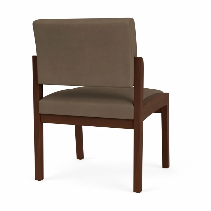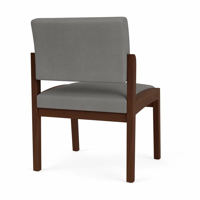 The Lenox Wood armless guest chair with its graceful transitional styling and upholstered seat and back cushions will give your space a light, airy look. Features include sturdy hardwood construction, durable lacquer finish, and a comfortable Matrex seat support system. Available in stain-resistant solid fabric, alluring designer fabric, and easy-clean, heavy-duty vinyl and polyurethane upholstery options.