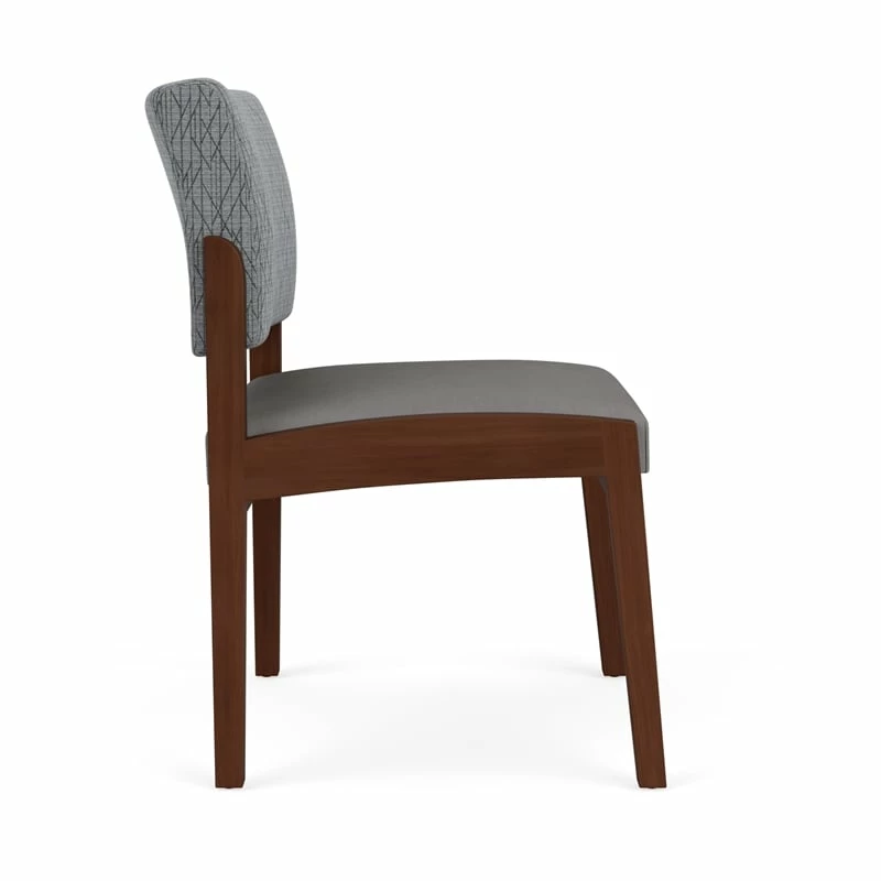 - Solid hardwood armless guest chair with upholstered seat and back