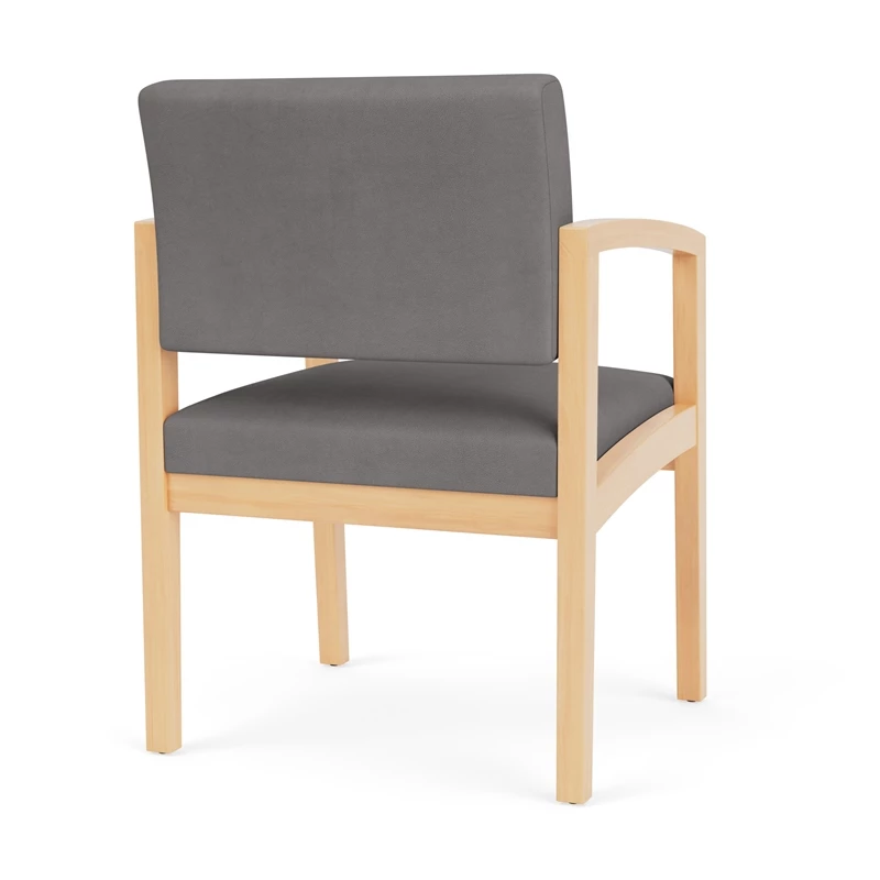 The Lenox Wood guest chair with its graceful transitional styling, gently sloped arm design, and upholstered seat and back cushions will give your space a light, airy look. Features include sturdy hardwood construction, durable lacquer finish, and a comfortable Matrex seat support system. Available in stain-resistant solid fabric, alluring designer fabric, and easy-clean, heavy-duty vinyl and polyurethane upholstery options.