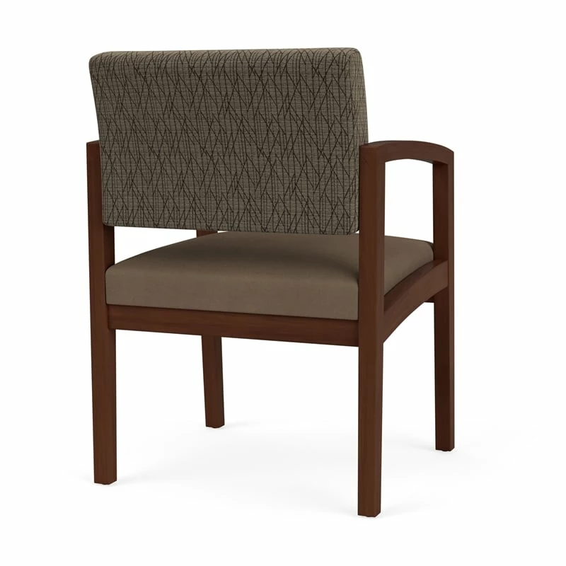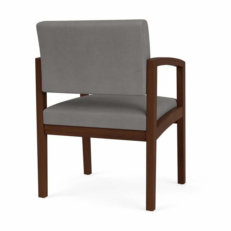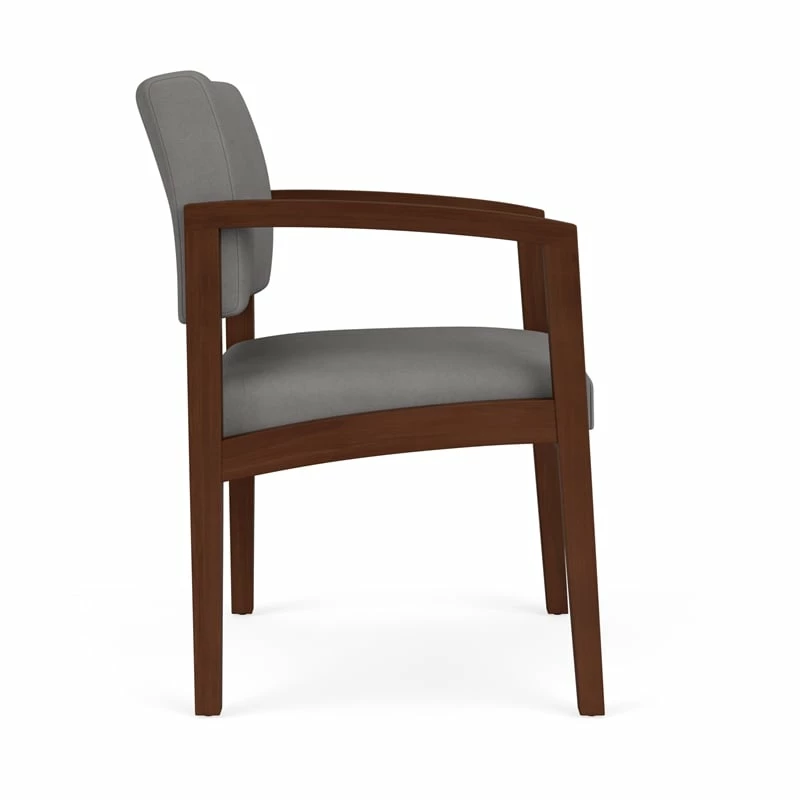The Lenox Wood guest chair with its graceful transitional styling, gently sloped arm design, and upholstered seat and back cushions will give your space a light, airy look. Features include sturdy hardwood construction, durable lacquer finish, and a comfortable Matrex seat support system. Available in stain-resistant solid fabric, alluring designer fabric, and easy-clean, heavy-duty vinyl and polyurethane upholstery options.