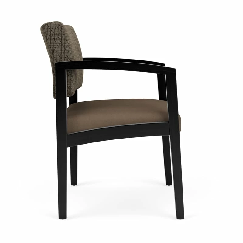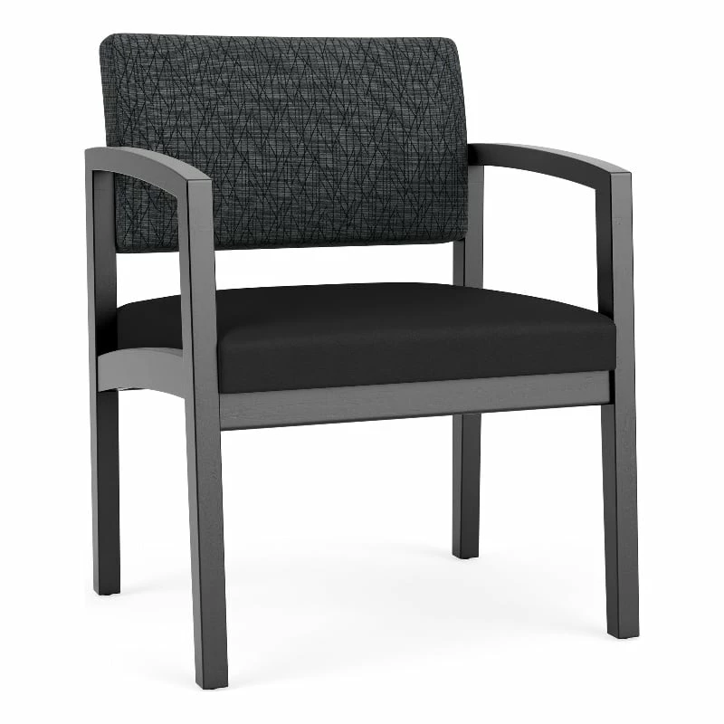 The Lenox Wood oversize guest chair with its graceful transitional styling, gently sloped arm design, and upholstered seat and back cushions will give your space a light, airy look. Features include sturdy hardwood construction, durable lacquer finish, and a comfortable Matrex seat support system. Available in stain-resistant solid fabric, alluring designer fabric, and easy-clean, heavy-duty vinyl and polyurethane upholstery options.