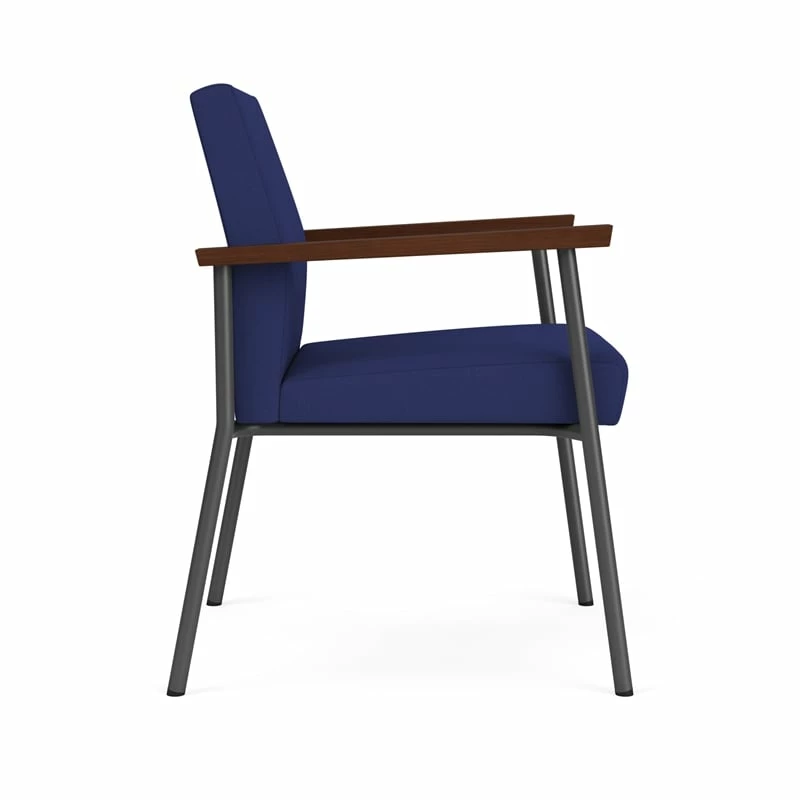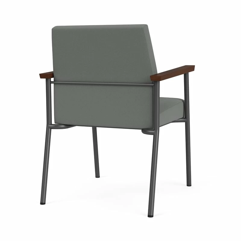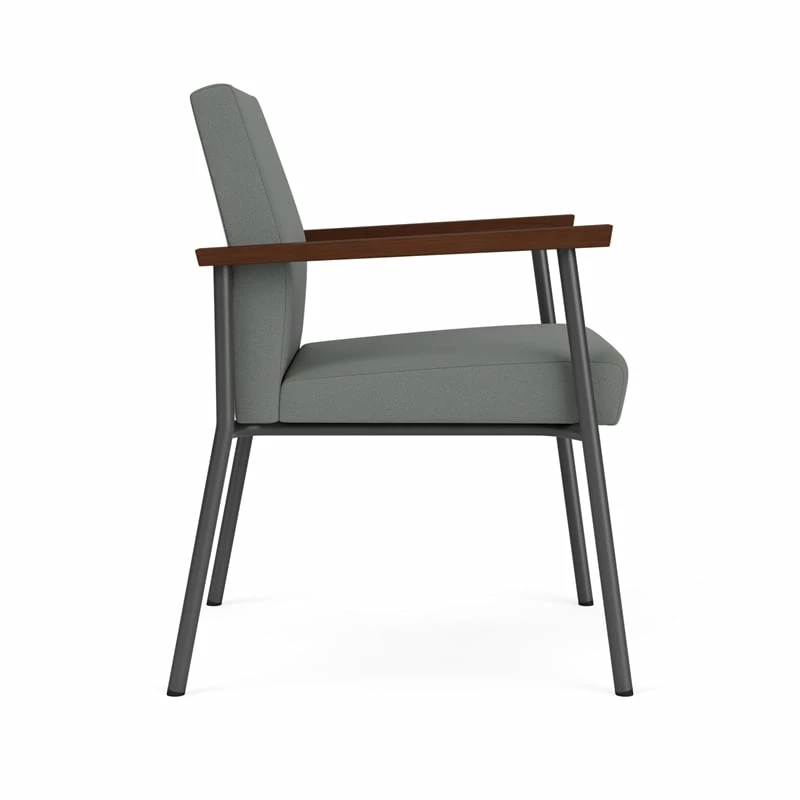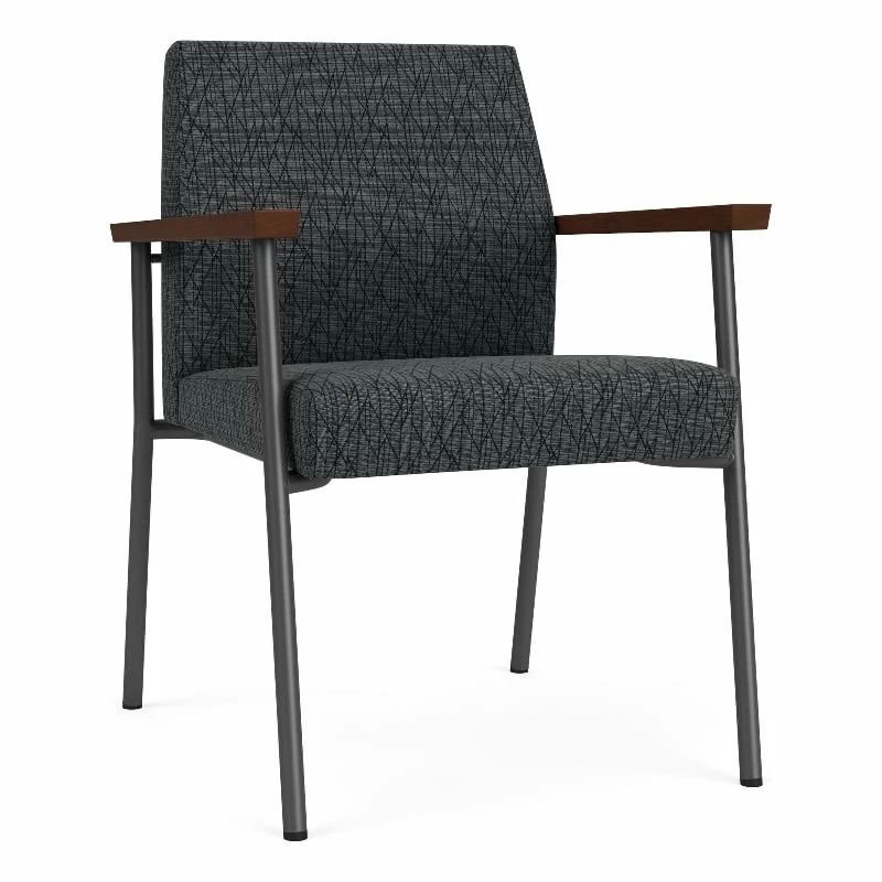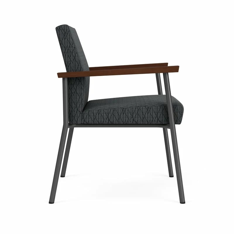 The Mystic guest chair with its refined, tapered back and striking geometric arm design will give your space a clean, contemporary look. Features include sturdy steel construction, solid hardwood armrests with durable lacquer finish, and a comfortable Matrex seat support system. Alluring upholstery options.