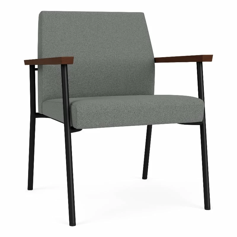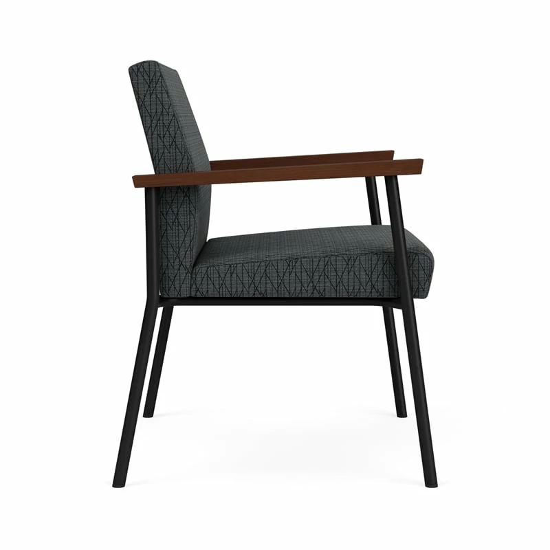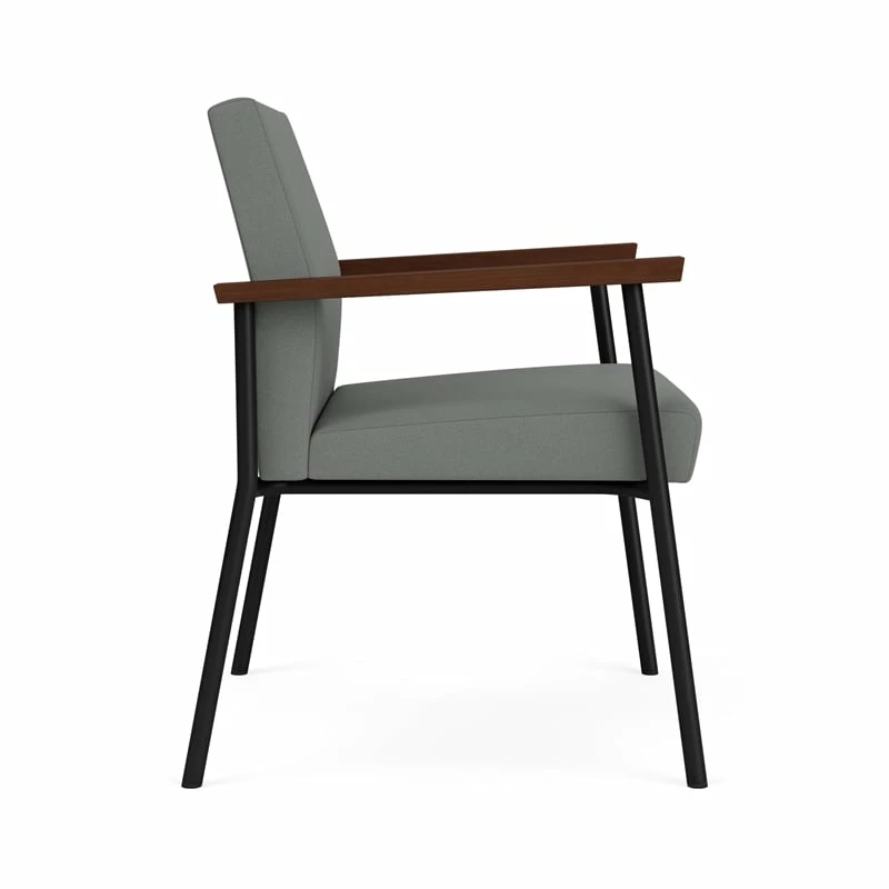 The Mystic oversize guest chair with its refined, tapered back and striking geometric arm design will give your space a clean, contemporary look. Features include sturdy steel construction, solid hardwood armrests with durable lacquer finish, and a comfortable Matrex seat support system. Alluring upholstery options.