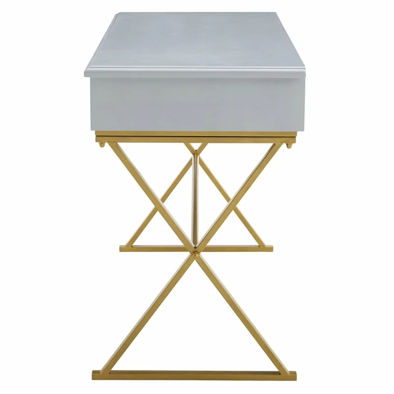 Sleek and stylish, the White Campaign Desk blends modern elements to create a chic yet versatile piece. The classic trestle-style frame features a gleaming brass finish that contrasts against the white top for a dramatic effect. Top with flowers, a lamp, or framed photographs to dress up an empty hallway or entryway or add it to a living room or bedroom to create a dynamic workspace. Available in black and white.