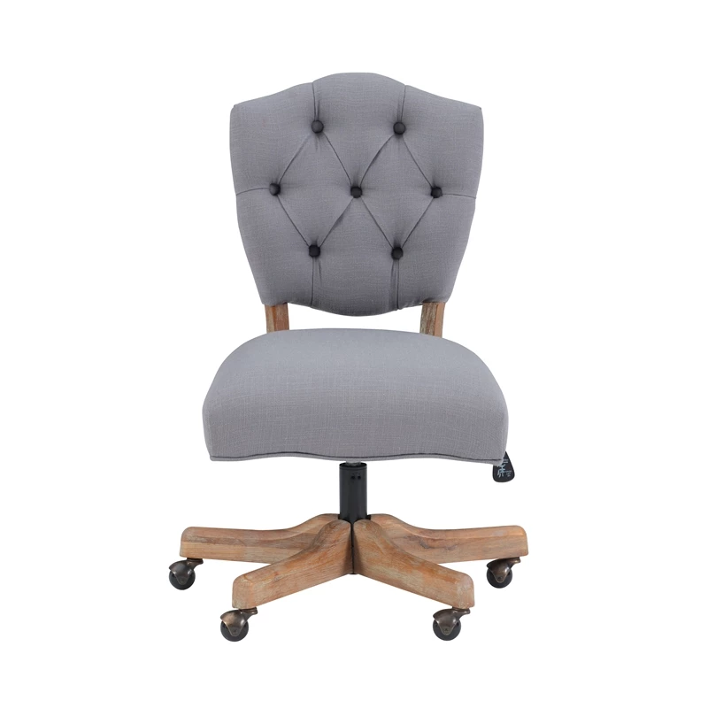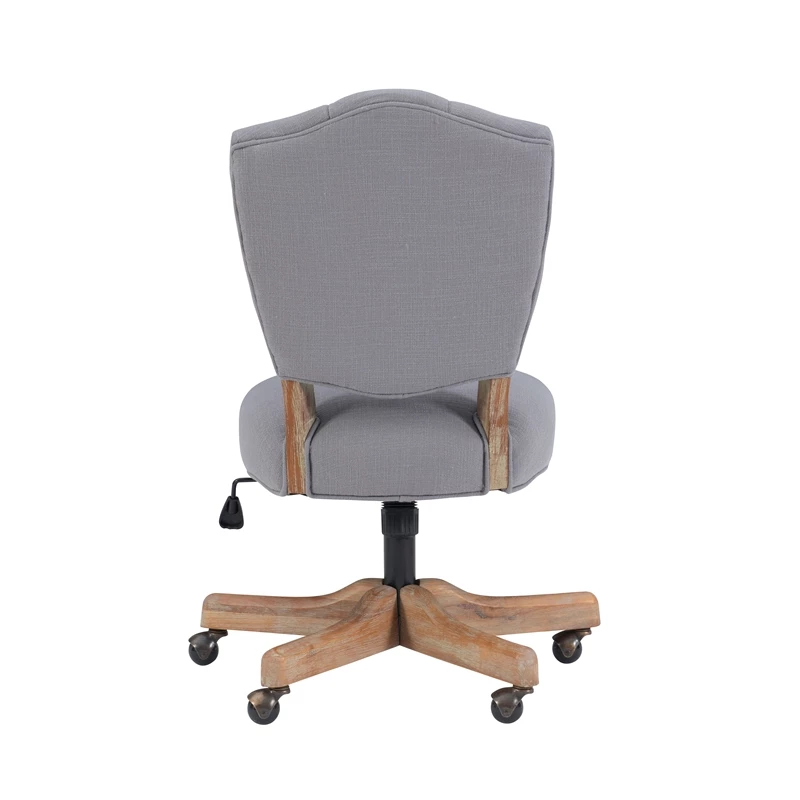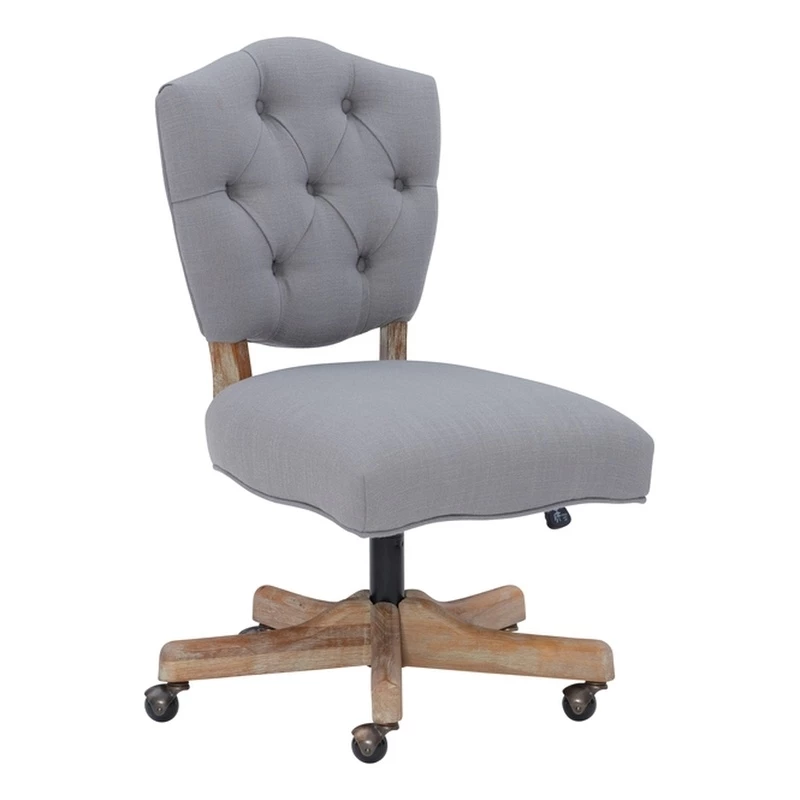 The Kelsey Office Chair delivers a traditional yet stylish element to any workspace. The detailed tufted back and padded gray seat bring out the chairs timeless design, while a gray wash base accents the chair and provides a rustic feel. The adjustable height allows the chair to work with any style desk, and durable casters help you move about your space with ease. Perfect for any home workspace or office.