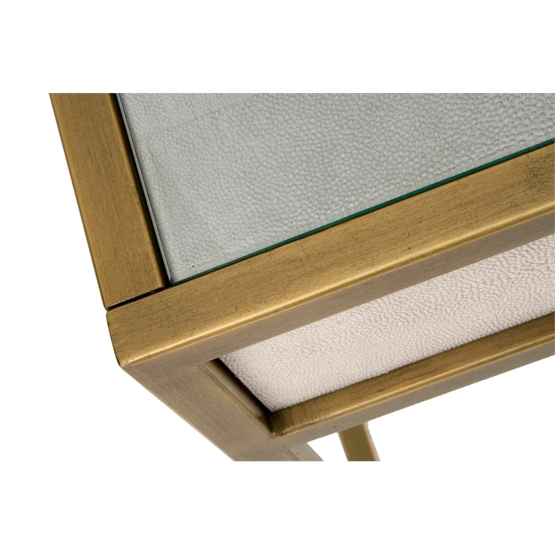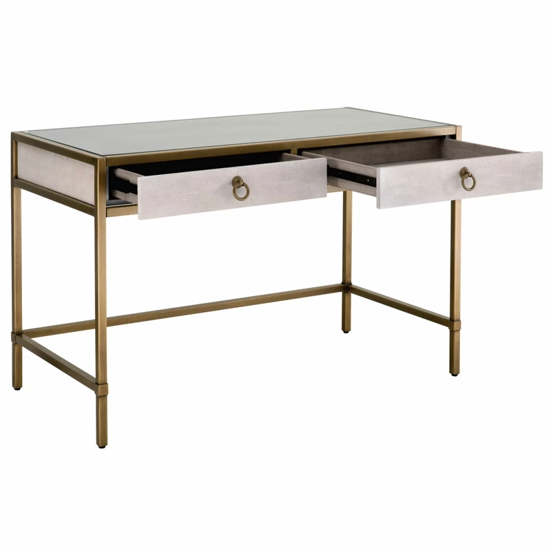 Transitional style writing desk featuring two storage drawers with Brushed Gold ring pulls.