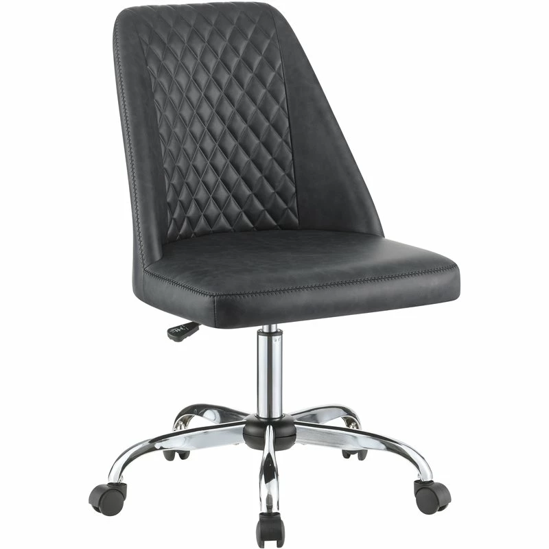 Pull this contemporary accent chair up to a workstation in your home office. Wrapped in a supple leatherette, this office chair features a bucket style seat with a diamond tufted backrest and a smooth cushion. Capable of getting around the office, this chair also features five caster wheels attached to a shiny chrome base. Highly functional, this office chair can also be raised and lowered to suit your existing desk height. Place this stylish chair in a modern home office for comfort and versatility.