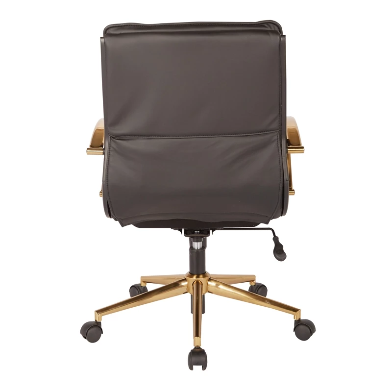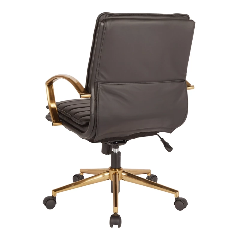 An office chair that feels better in leather. Thick and contoured seating with little resistance to the comfort you deserve. All packed with adjustable features such as pneumatic height adjustment, built-in lumbar support, and locking tilt control with adjustable tilt tension. This chair is decorated with extravagant gold accents that cover the arms and base in luxury. Don’t you deserve to feel good while you work? Pair functionality and charm with the Mid-Back Faux Leather Chair from Worksmart.