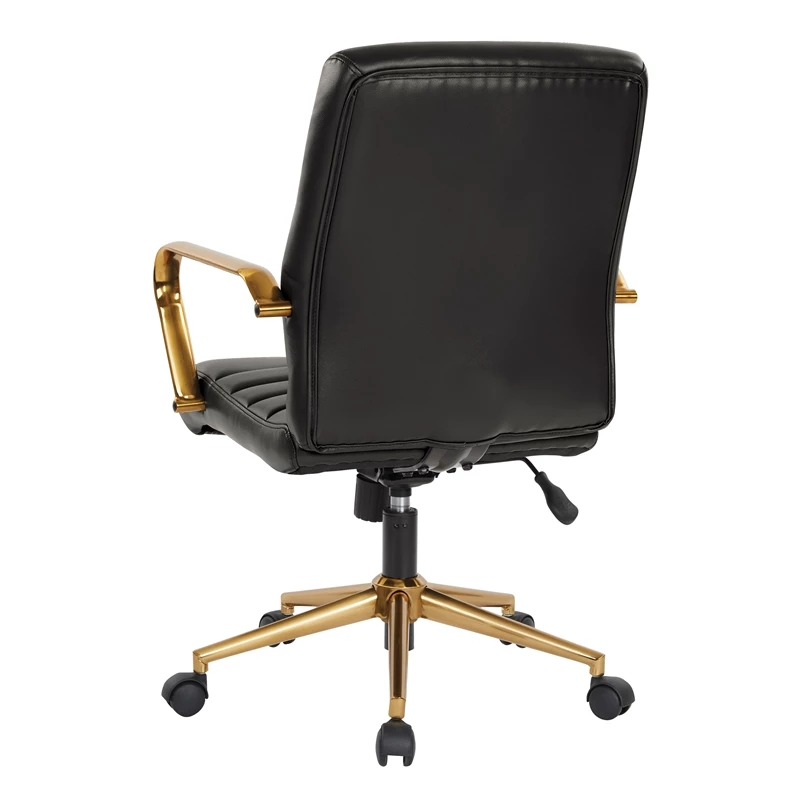 The Baldwin Mid-Back Faux Leather Chair features an attractive gold finished base and arms with all the ergonomic comfort of a modern office chair. Alongside built-in lumbar support, this chair features one-touch pneumatic seat height adjustment, locking tilt control, adjustable tilt tension, and dual wheel carpet casters.