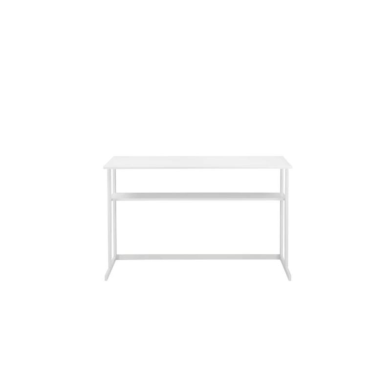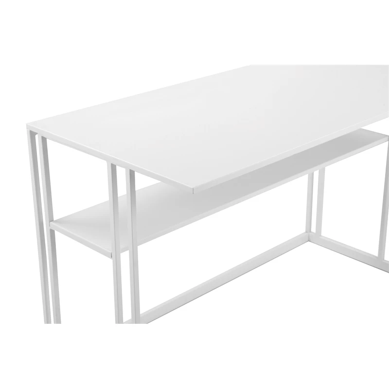 Modern and minimalist all metal desk in white with clean lines and in uniform color. Includes lower one shelf for storage.