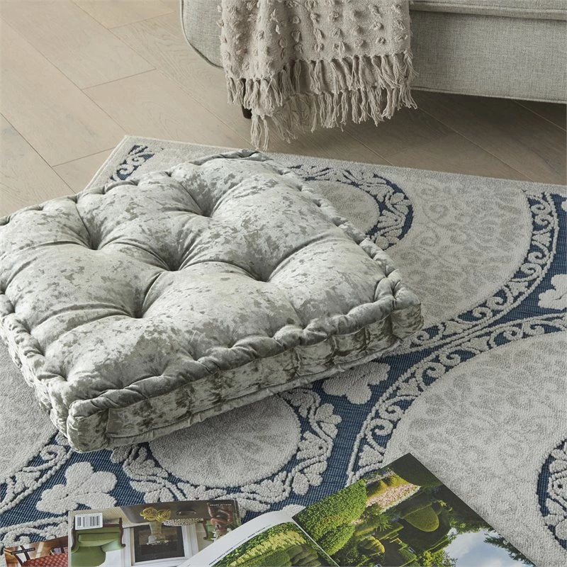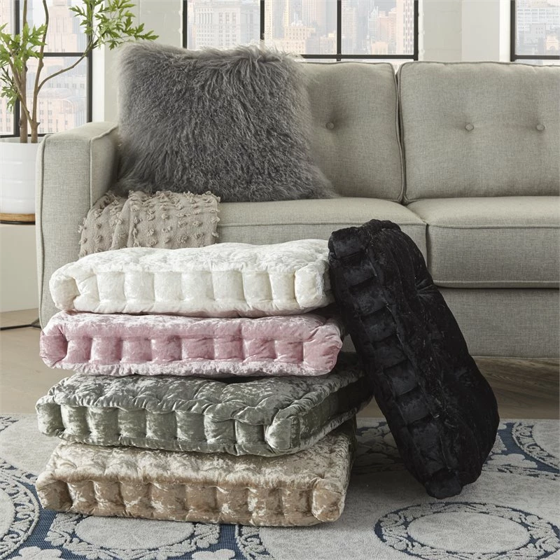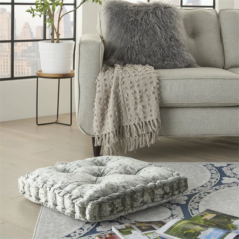 Relax in the comfort of this Mina Victory Home Accents seat cushion. Stuffed with plush polyester and wrapped in luxe gray poly-velvet, this classic tufted cushion will easily become a staple for your floor or chair seating. Combine several to make a larger seating area, or mix and match between our other available colors and sizes for an extra cozy lounge area! This handmade design is a versatile fit for glam, modern, and boho decor. 24-inch x 24 -inch x 4-inch size.