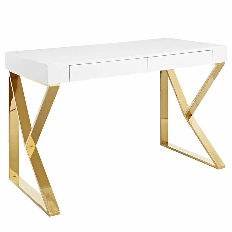 Converge diverse elements with the Adjacent Desk. Designed to portray progress and ski slope riding momentum, Adjacent features a boxy high gloss veneer top, sleek polished steel base, and non-marking foot pads. Complete with dual drawers with full glide extension, store your writing or drawing implements, notebooks, journal, and other creative elements as you soar along with a piece perfect for modern and contemporary workspaces.