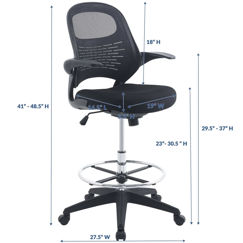 Rethink the way you go about tackling the day with the Advance Drafting Stool in Mesh. Designed with 90 degree vertically rotating armrests, Advance was so named after the stirrings of enthusiasm it helps activate. Complete with a mesh back that combines both form-fitting ergonomics and the progressive nature of achievement, Advance keeps productivity high while lowering both mental and physical stress. Made with a durable nylon frame and full 360-degree swivel, this drafting stool installment of the Advance series also features an extra tall gas cylinder and sturdy chrome-plated steel foot ring to enhance posture. Complete with one-lever height adjustment and five dual-wheel casters for easy gliding over carpeted surfaces, Advance is a formative drafting stool for either home or office.