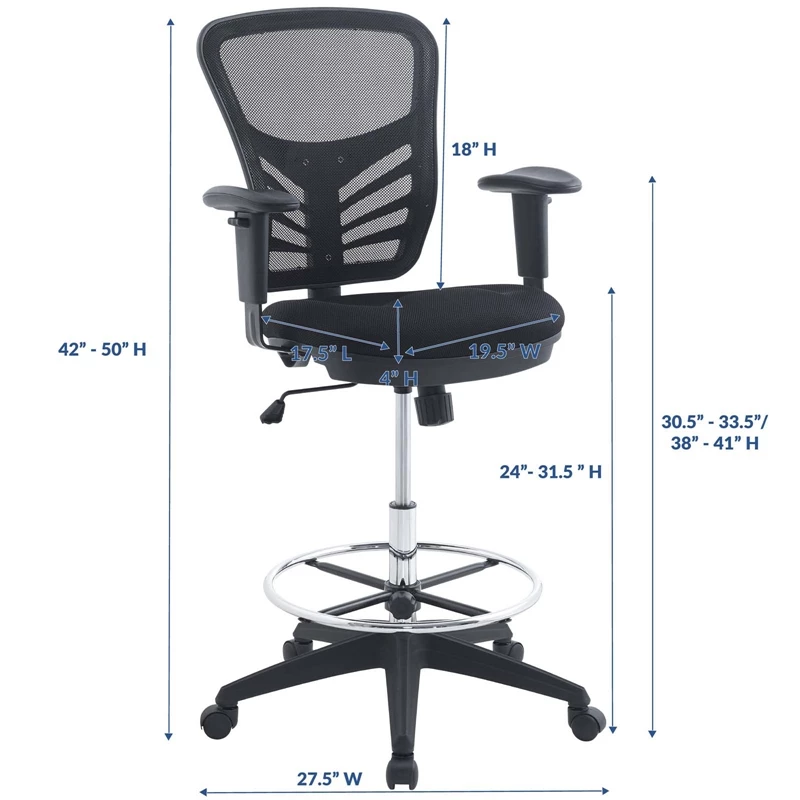 Mark a turning point in your office tasks with the Articulate Drafting Stool in Mesh. Articulate makes it easy to relax into work with breathable mesh back and comfortable fabric cushion seat that serves as a simple extension to your everyday work ventures. This drafting stool installment of the Articulate series features height adjustable armrests, tilt tension control, an extra tall gas cylinder, and a sturdy chrome-plated steel foot ring to enhance posture. Fitted with five hooded dual-wheel casters, give yourself the ability to easily glide over carpeted floors while naturally performing tasks.