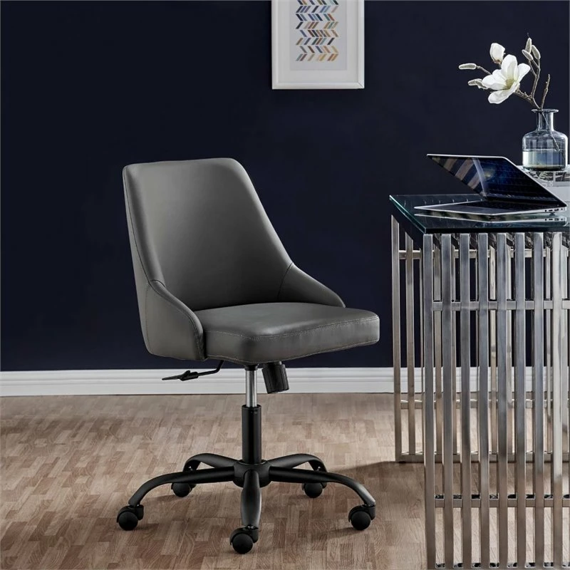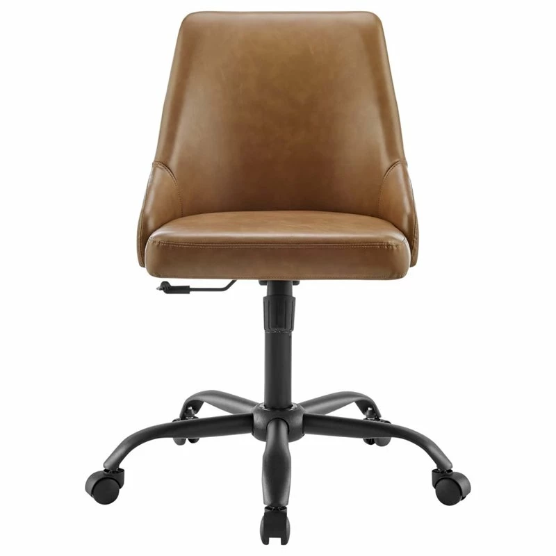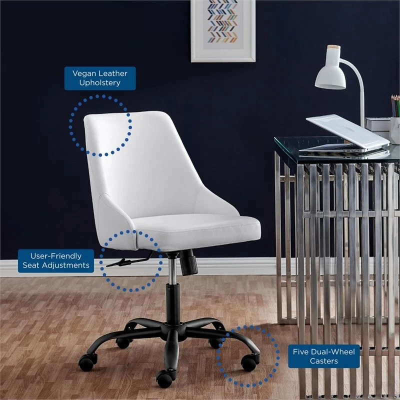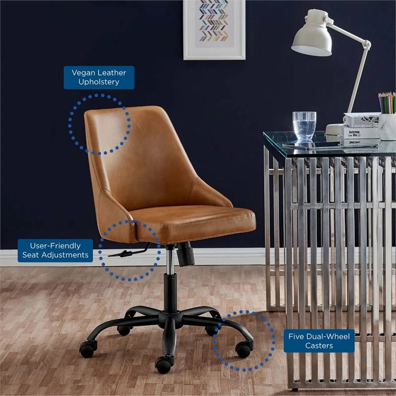 Bring modern style and sleek elegance to the home office with the Designate Vegan Leather Office Chair. Featuring clean lines and a tailored profile, this desk chair is padded in dense foam and upholstered in smooth vegan leather offering a supportive, comfortable place to sit during the workday. A black powder-coated base and five dual-wheeled nylon casters provide easy movement over hardwood or carpeted surfaces while the full 360-degree swivel, tilt tension control, and pneumatic height adjustment create a custom seating experience. Perfect for the modern home or office, this office chair is a desirable addition to any workspace.
