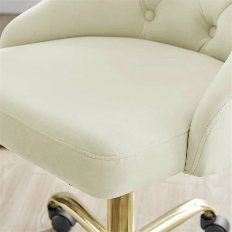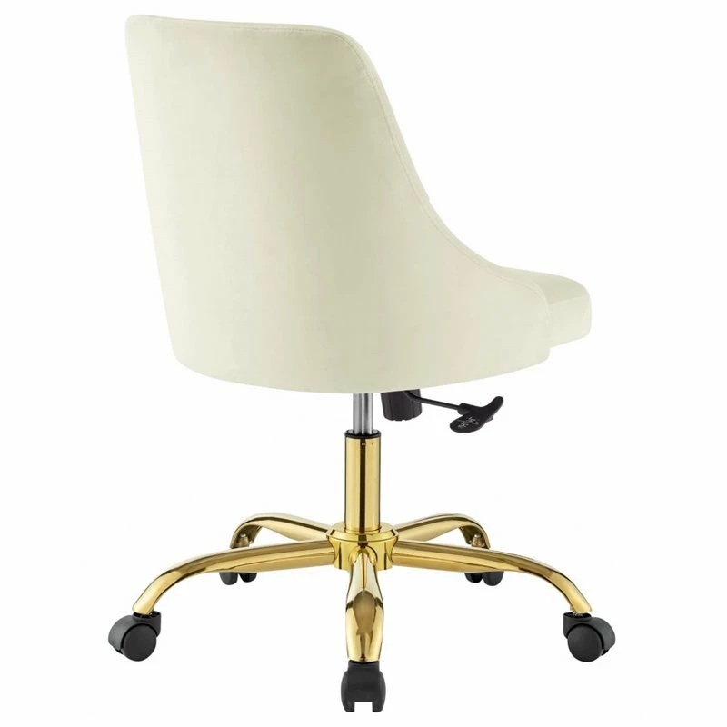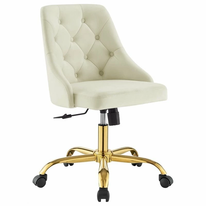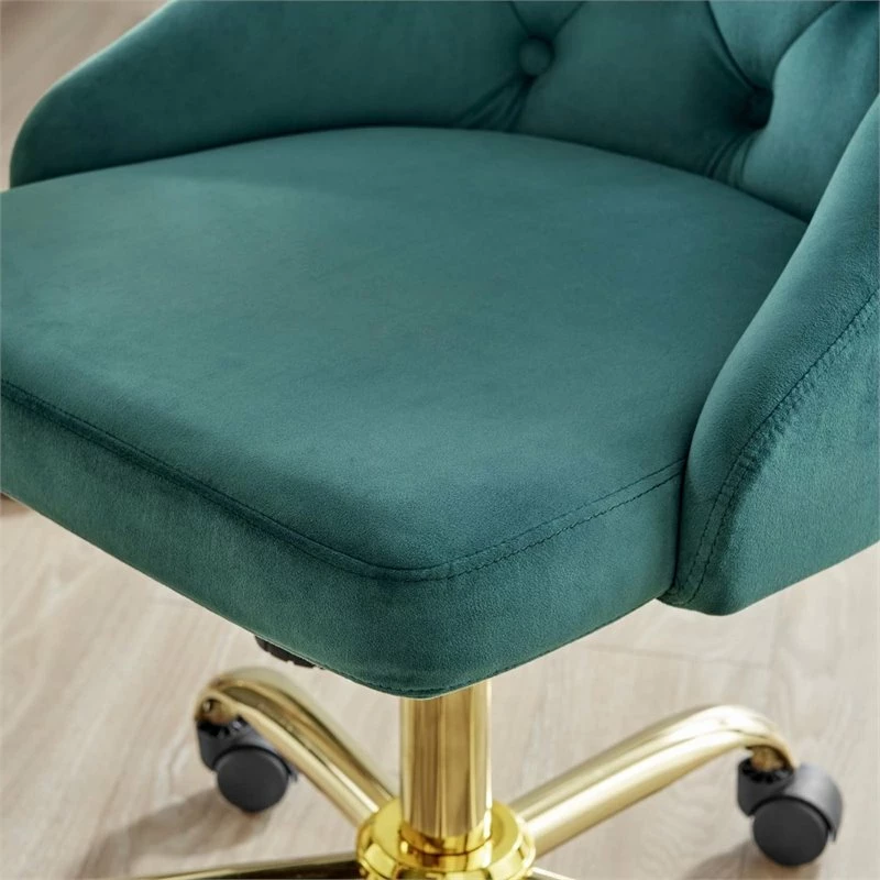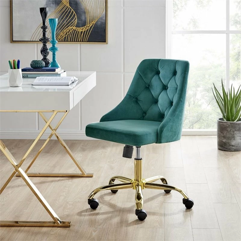 Introduce glam deco style and vintage modern elegance to your home office with the Distinct Tufted Performance Velvet Office Chair. Featuring gold metal accents and beautiful button tufting, this desk chair is padded in dense foam and upholstered in soft, stain-resistant performance velvet offering a supportive, comfortable place to sit during the workday. A chrome gold base and five dual-wheeled nylon casters provide easy movement over hardwood or carpeted surfaces while the full 360-degree swivel, tilt tension control, and pneumatic height adjustment create a custom seating experience. Perfect for the modern home or office, this office chair is a desirable addition to any workspace.