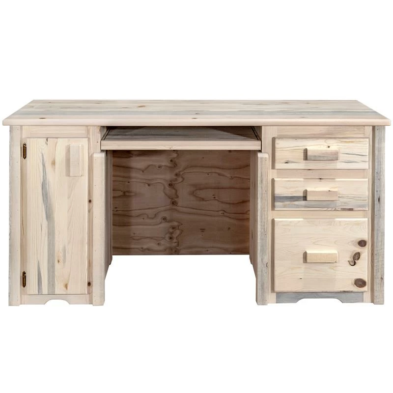 From Montana Woodworks®, the largest manufacturer of handcrafted, heirloom quality rustic furnishings in America comes the Homestead Collection line of furniture products. Handcrafted in the mountains of Montana using solid, American grown wood, the artisans rough saw all the timbers and accessory trim pieces for a look uniquely reminiscent of the timber-framed homes once found on the American frontier. Designed with beauty to equal its practicality and usefulness, this Montana Woodworks® computer desk is just right for the home office or student’s room. Montana Woodworks® skilled artisans who translate the beauty of nature into the lines of these high-quality, solidly functional desks, each piece is designed to last a lifetime. The keyboard tray, letter sized file drawer and tower slide all have full extension, ball bearing slides while the two smaller desk drawers feature easy glide slides. Comes fully assembled. This item is sold “ready to finish” i.e., it is ready for the purchaser to paint, stain or stain and lacquer. 20-year limited warranty included at no additional charge.