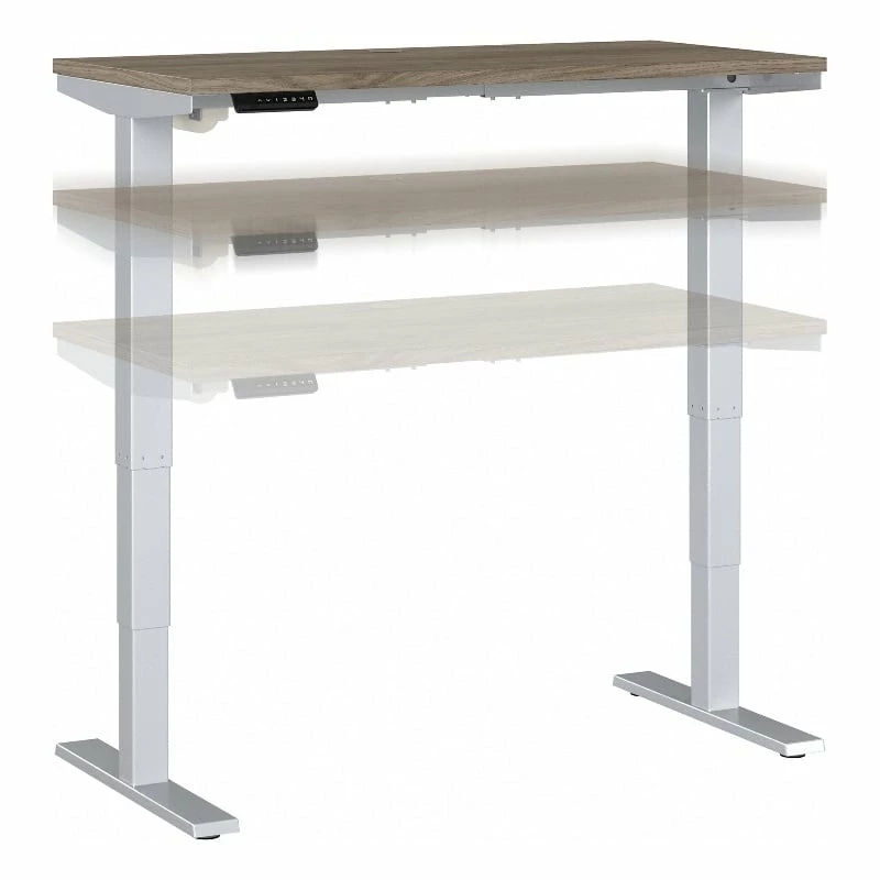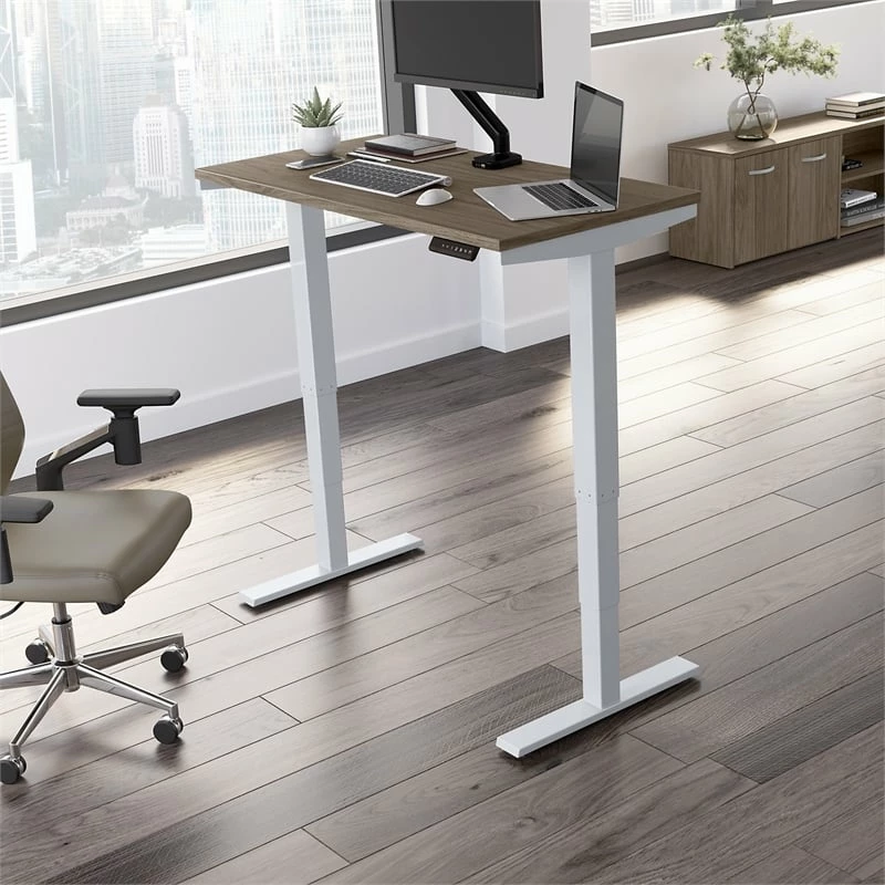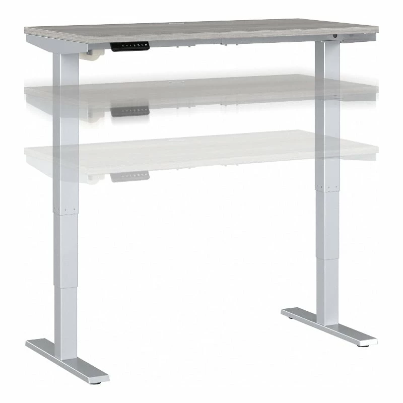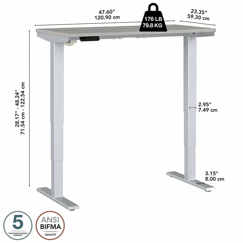 Bush Business Furniture’s Move 40 Series Electric Height Adjustable Standing Desk is a perfect way to build an ergonomic workspace without the high-end price tag. The 48W x 24D desktop lifts anywhere from 28 to 48 inches from the floor at a speed of 1.25 inches per second. The control panel includes four programmable presets that save your favorite heights so you can change positions without missing a beat. The Adjustable Desk also features an Anti-Collision Sensor that stops movement up or down if an object is detected. Built to endure the rigors of a busy professional environment, the thermally fused laminate work surface resists scratches and stains while a welded 16-gauge steel base allows the desktop to support up to 176 pounds. This Ergonomic Office Desk has been tested to meet or exceed ANSI/BIFMA standards for safety, durability and performance and is backed by a 5 Year Warranty.