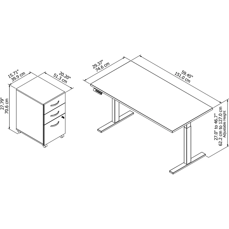Have a healthy and productive day at the office with the Move 60 Series by Bush Business Furniture 60W x 30D Height Adjustable Standing Desk with Mobile File Cabinet. Those who use sit to stand desks report improved attitudes, energy and comfort while getting more done, and the Move 60 Series provides an affordable solution. Sit and stand throughout your day without missing a beat in your home office or at work. The electric adjustable height Desk includes a 10 foot power cord and smoothly lifts from a low of 27 inches to a high of 46.7 at the push of a button. Store your favorite heights with four programmable presets so you can use them as often as you like. The ergonomic Desk withstands years of everyday use. A durable thermally fused laminate finish resists scratches and stains, while the sturdy steel base creates a weight capacity of up to 200 pounds. This sit to stand Desk will have no problem holding all of your work materials. The 3 Drawer Mobile File Cabinet rolls with you throughout your office or remains in place as needed on any surface. A full-extension file drawer glides on smooth ball bearing slides for an easy reach to letter, legal and A4-size paperwork. Backed by a 5 Year Warranty, the Height Adjustable Standing Desk with Storage meets ANSI/BIFMA quality standards for safety and performance. A variety of finishes and sizes fit home offices, large multi-person workspaces or anywhere in between. Find the right height for you with Move 60.
