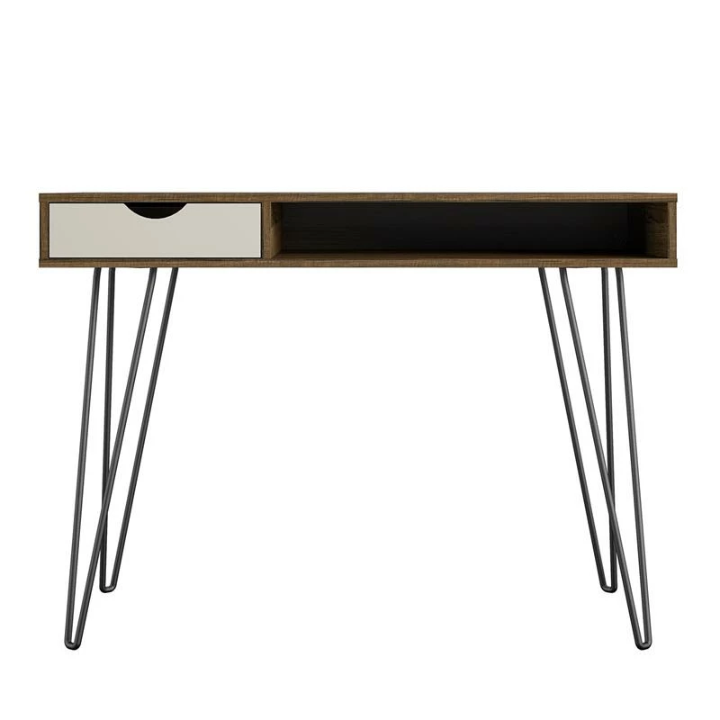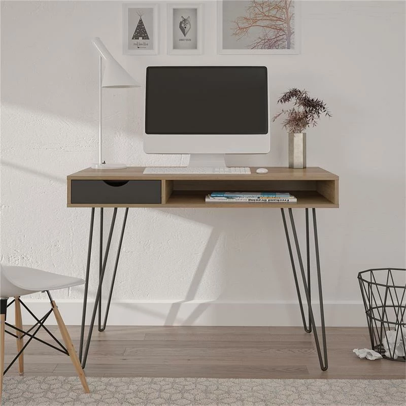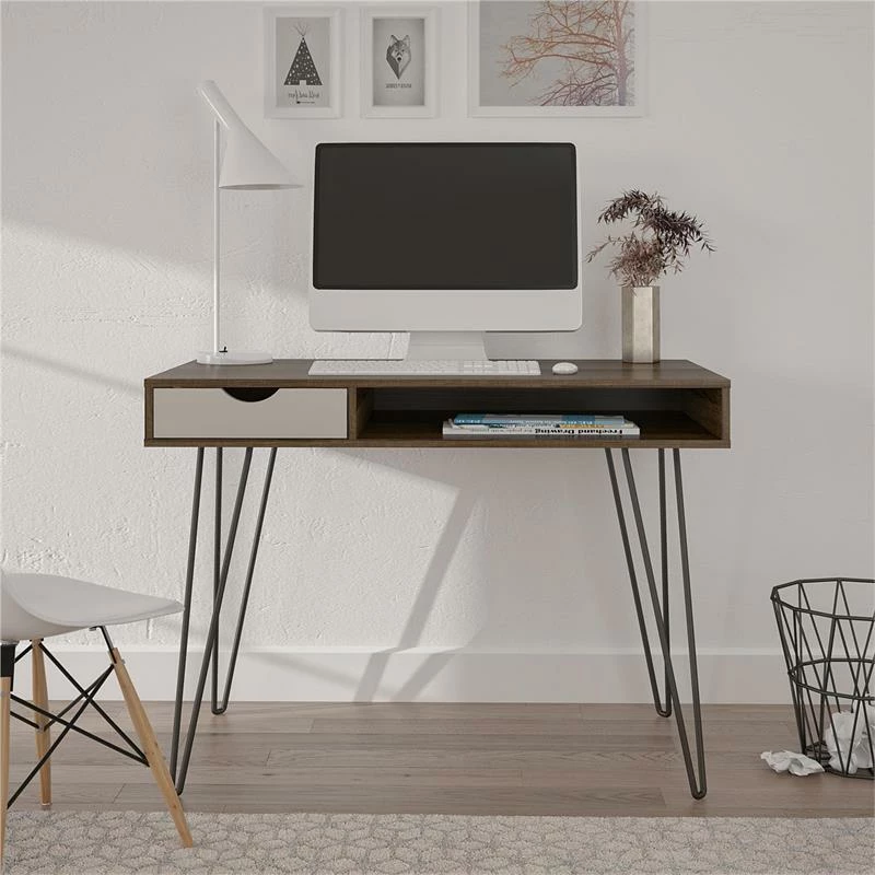 - The dark brown woodgrain chassis and contrasting gray drawer front with light brown undertones on the laminated particleboard offer a strong build that complements the mid-century inspired black metal hairpin legs