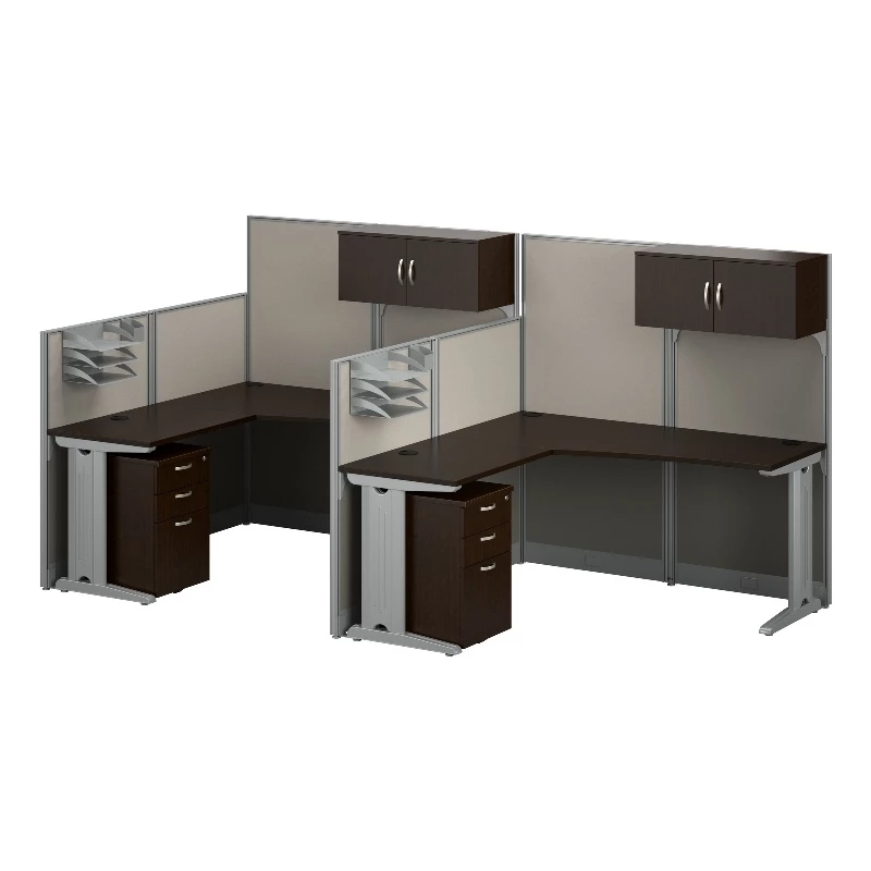 Bush Business Furniture’s Office in an Hour Collection is an ideal solution for converting empty space into a productive work environment. Designed with convenience in mind, this 2 Person L Shaped Cubicle Desk with Storage Set is simple to order and install so you can get your workplace up and running instantly. The commercial office desks feature a thermally fused laminate finish that protects against cosmetic damage. The Mobile File Cabinets’ locking drawers hold letter, legal, and A4-size files along with supplies and personal items. Storage Cabinets can be mounted to either side of the tall cubicle panels for easy access to materials while Paper Trays and Pencil Holders organize work-in-progress and writing utensils. This 2 Person L Shaped Desk Set has been meticulously tested to meet or exceed ANSI/BIFMA standards for safety and performance and is backed by a 10 Year Warranty.