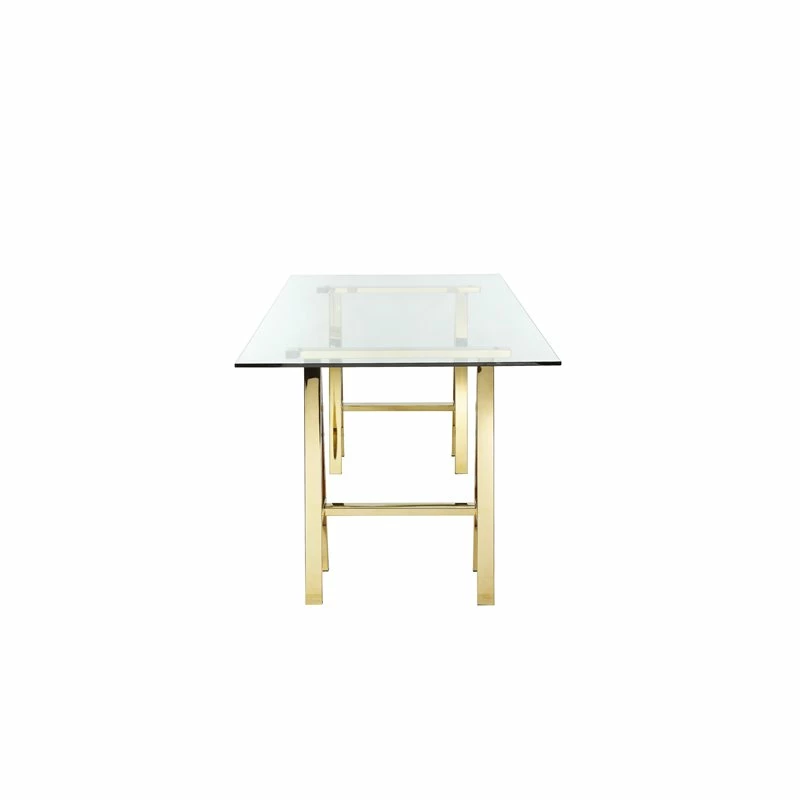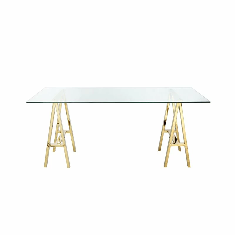 A simple and elegant glass top desk with high polish gold sawhorse style legs. This desk is perfect for any space, and the large desktop has more than enough space to get any kinds of work done. No assembly required.