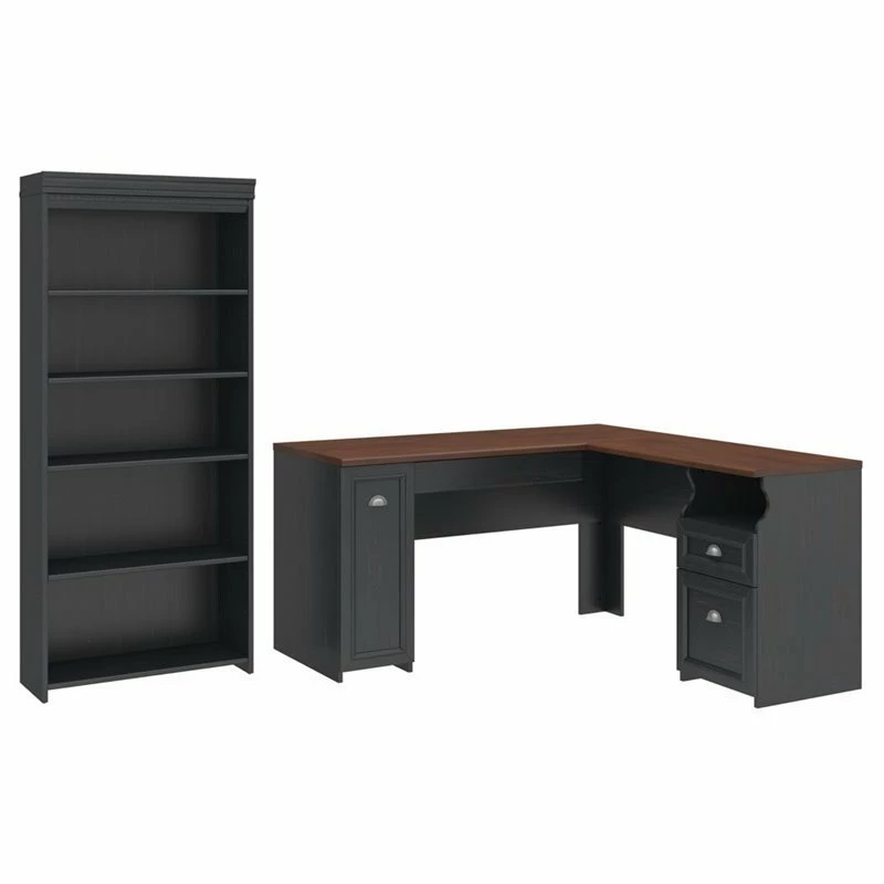 Bring a slice of cottage comfort into your home office with the Pemberly Row L Shaped Desk and 5 Shelf Bookcase. Enjoy your morning coffee, surf the net and pay bills with plenty of room to spare on the L Shaped Desk’s durable surface. Stash pens, paper and checkbooks in the box drawer and open storage space, while organizing mail in the file drawer to clear the work surface. Store your laptop or keyboard in a drawer with a drop-down front, and take advantage of a large vertical closed storage area with an adjustable shelf. Charming accents and Antique Pewter hardware add character to your home office. The Bookcase features three adjustable shelves so you can display books and knickknacks of varying sizes, and two fixed shelves for stability. Available in attractive Antique Black with Hansen Cherry Accents or Antique White with Tea Maple Accents, meets ANSI/SOHO quality test standards for performance and safety and comes with a Pemberly Row 6 Year Manufacturer’s Warranty.