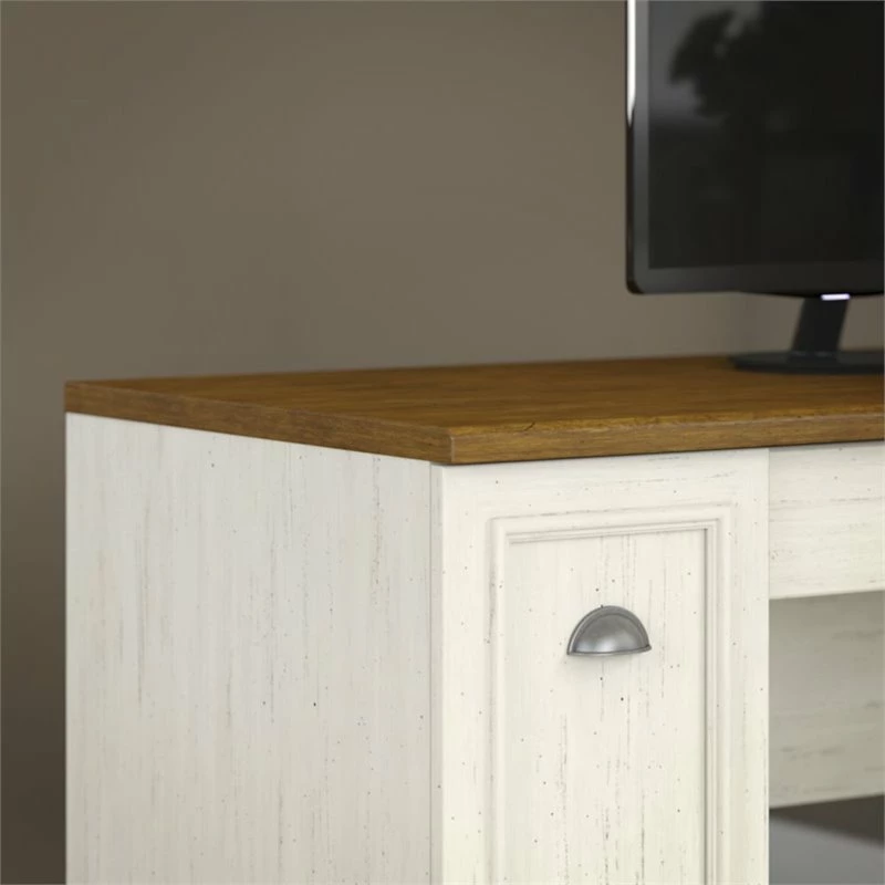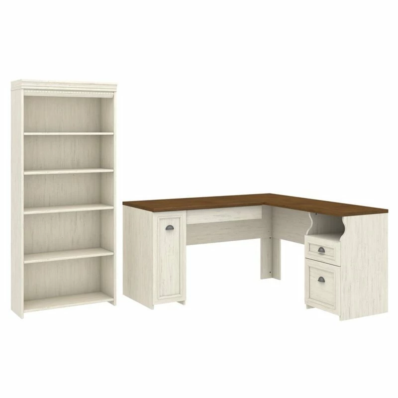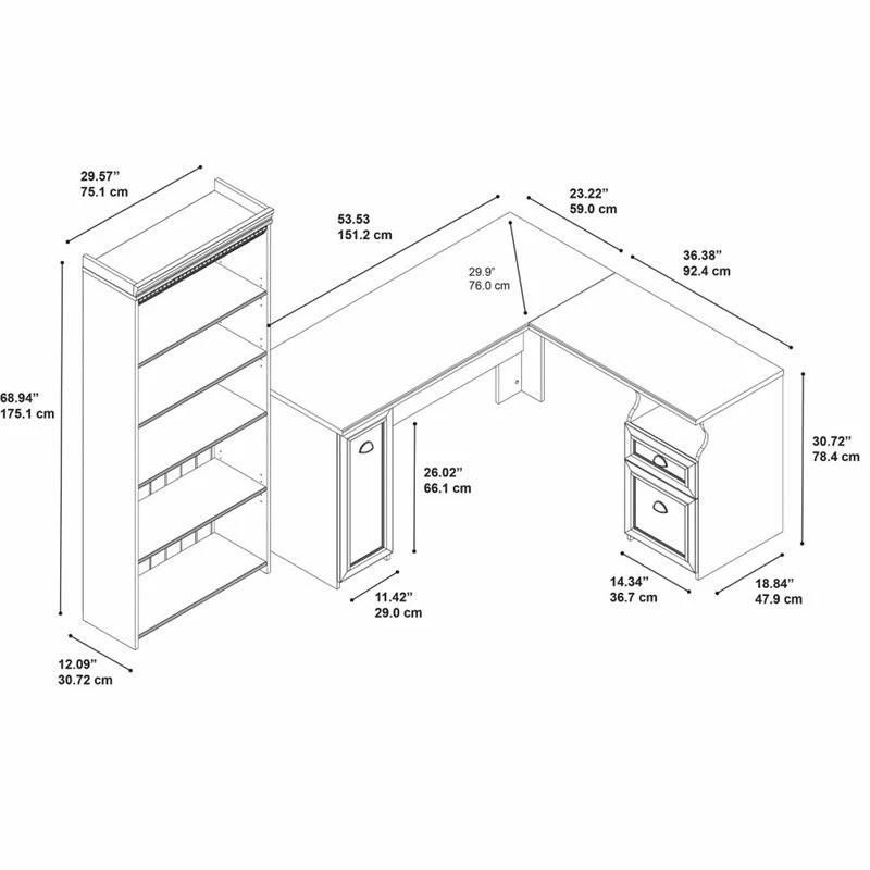 Bring a slice of cottage comfort into your home office with the Pemberly Row L Shaped Desk and 5 Shelf Bookcase. Enjoy your morning coffee, surf the net and pay bills with plenty of room to spare on the L Shaped Desk’s durable surface. Stash pens, paper and checkbooks in the box drawer and open storage space, while organizing mail in the file drawer to clear the work surface. Store your laptop or keyboard in a drawer with a drop-down front, and take advantage of a large vertical closed storage area with an adjustable shelf. Charming accents and Antique Pewter hardware add character to your home office. The Bookcase features three adjustable shelves so you can display books and knickknacks of varying sizes, and two fixed shelves for stability. Available in attractive Antique Black with Hansen Cherry Accents or Antique White with Tea Maple Accents, meets ANSI/SOHO quality test standards for performance and safety and comes with a Pemberly Row 6 Year Manufacturer’s Warranty.