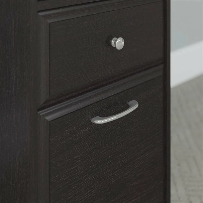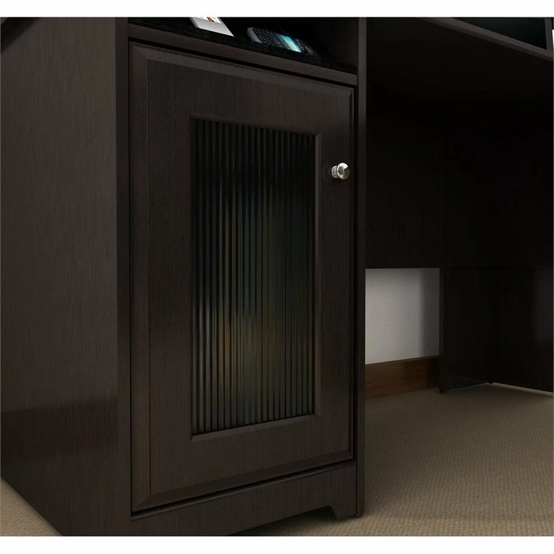 Pemberly Row Collection 60W L-Desk offers a spacious and efficient workplace for your home or office. The L-shaped design provides a large durable work surface and a 60W Hutch adds ample storage to any office when used on top of the desk. A self-sustaining flip-up door conceals storage behind an elegant fluted glass panel and four open cubbies that offer easy access to papers or work in progress. The L-Desk has a matching fluted glass door, a box drawer for supplies and file drawer that accepts letter, legal or A4 sized files. Plus a built-in 4-port USB hub and a soft tray in open cubby to hold charging electronic devices. The 2 Door Tall Storage offers a stylish approach to concealed storage for books, personal items or supplies. Keep everything tidy and out of sight with two adjustable shelves and one fixed shelf that accommodate a variety of storage needs. Quality construction meets ANSI SOHO test standards for safety and performance. This rich Espresso Oak finish is accented by chrome hardware for a simple, elegant and timeless appearance. See the full collection for coordinating items available all backed by the Pemberly Row 1-year Manufacturer’s Warranty.