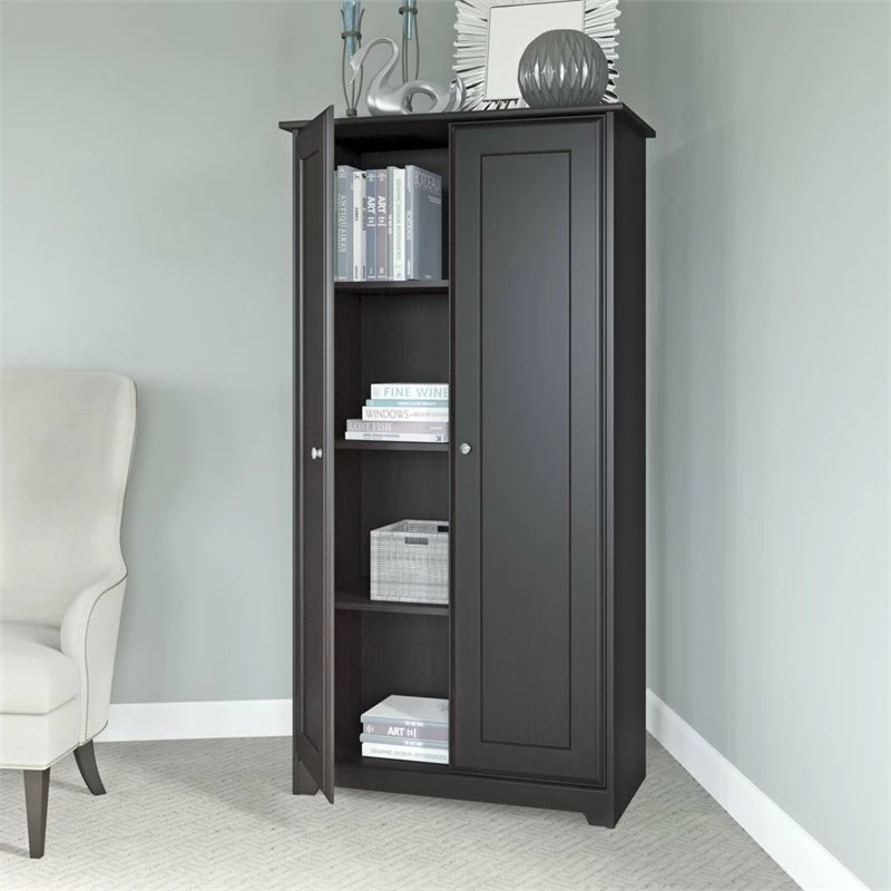 - Features closed tall storage with two adjustable shelves and one fixed shelf