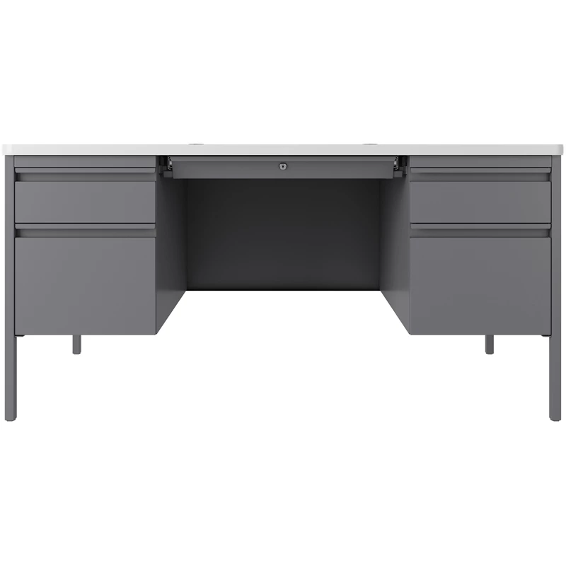 Double pedestal metal teachers desk in silver/platinum and has a white top that provides a practical desk solution to any educational environment. The T-shaped edge promotes safety while the laminate provides a durable scratch and stain resistant surface that is easy to clean.