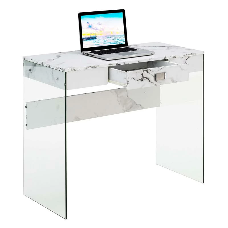 Revitalize your home decor with the 36 inch” Desk by Pemberly Row. With tempered clear glass side panels and a sleek silhouette, this piece displays a modern contemporary style. The top and back components are crafted from particle board that is finished with a rich melamine paper, making this item durable and easy maintenance. The versatility is endless with this chic design perfect for your living room or home study. Additional work supplies can be stored in the drawer. With roller style metal drawer slides, you will be able to open and close the drawer smoothly. Enjoy this desk right after delivery with its easy 2 step assembly. Pair with additional pieces from the Collection by Pemberly Row, each sold separately.