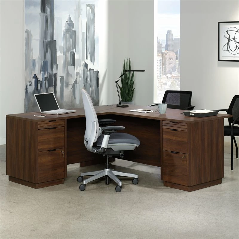 Bring on the toughest of workdays. You’ll be ready to face them with the L-shaped desk from the Pemberly Row. This L-shaped office desk comes with the pedestals and drawers pre-assembled, making your assembly process as easy as can be. A durable, 1″ thick top and end panels allow for a sturdy construction to hold your laptop, folders, a lamp, photos and more. The melamine top surface of this L-shaped desk is heat, stain, and scratch resistant and the impact resistant, high-grade thermoplastic edges add to the superior construction. All six drawers feature full extension slides while the lower drawers hold letter or legal size hanging files. The file drawer and middle drawer above on of this commercial office desk lock for security of your items. This resimercial desk is finished on all sides for versatile placement in your office and it looks polished from every angle. A cord management system including three desktop grommet holes keep your commercial office furniture free of cord clutter. Finished in Spiced Mahogany, this L-shaped desk brings together function and design for one beautiful piece.