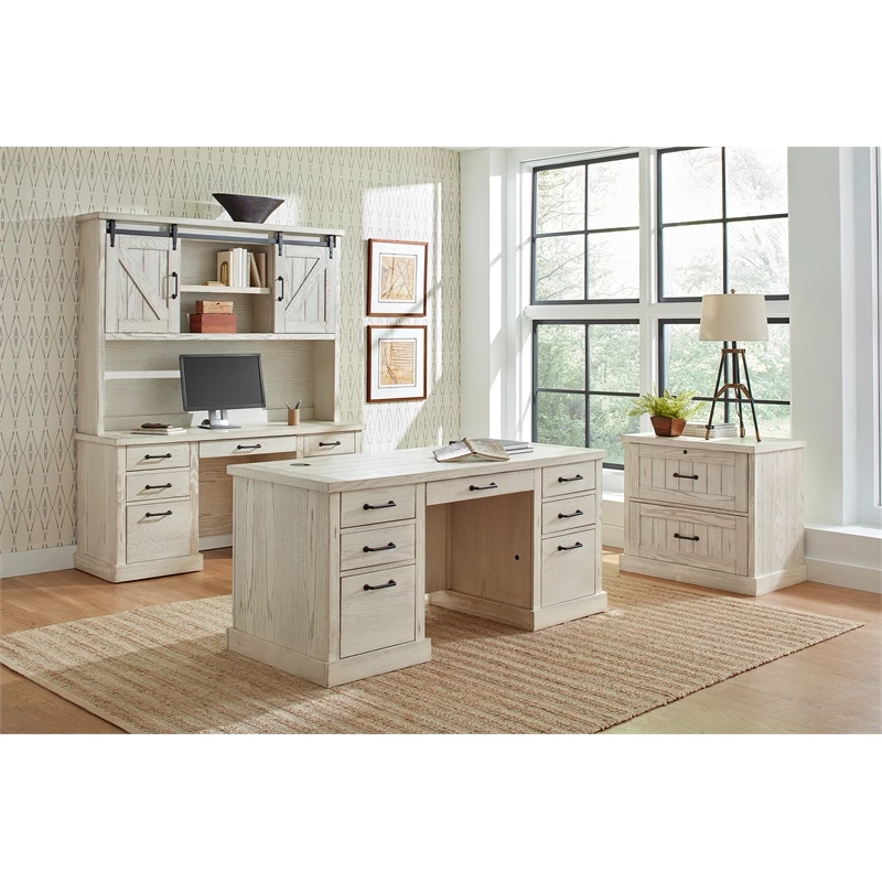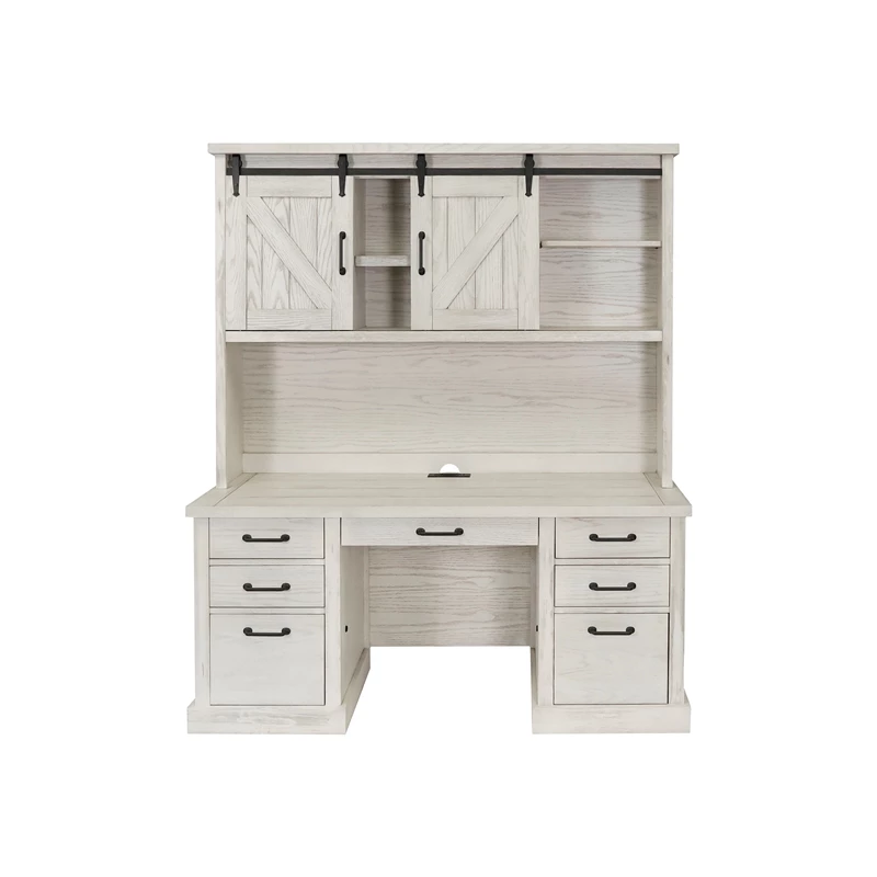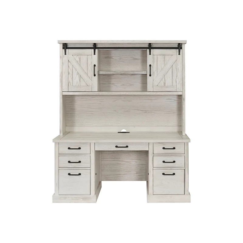 From the steel rails and exposed wheels to the mortise and tenon details, speaks to simplicity. The weathered brown oak finish is distressed to deliberately highlight it’s age and compliments the basic barn door style with heavy plank tops and timber legs. Avondale’s classic look with rustic wood and authentic hardware has clearly withstood the test of time. The brown white rustic desk has a center keyboard/pencil drawer, four utility drawers, two letter file drawers, a power center with AC outlets and USB 2.0 ports and is fully assembled.