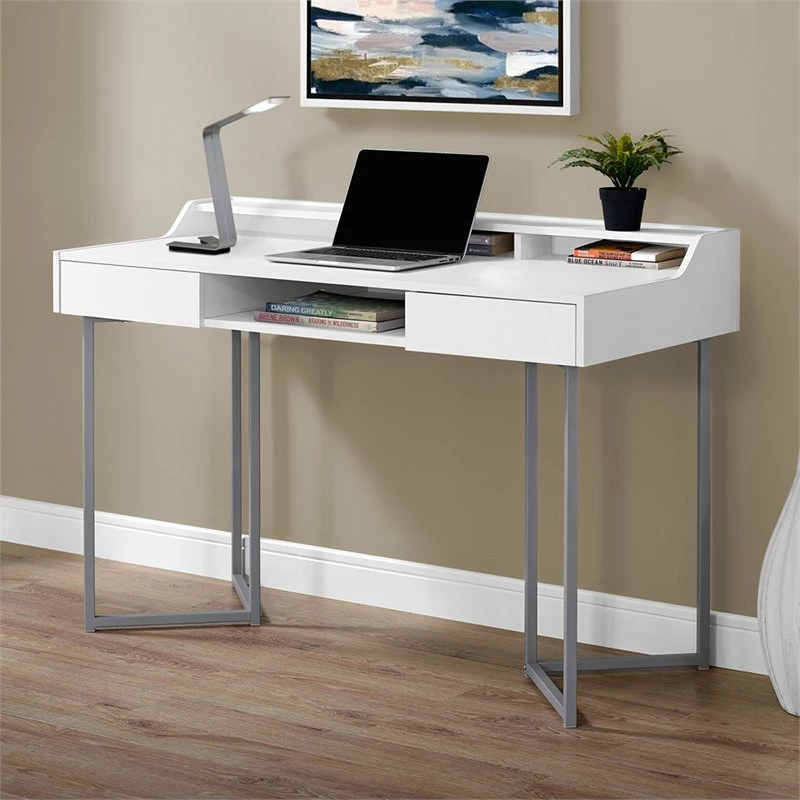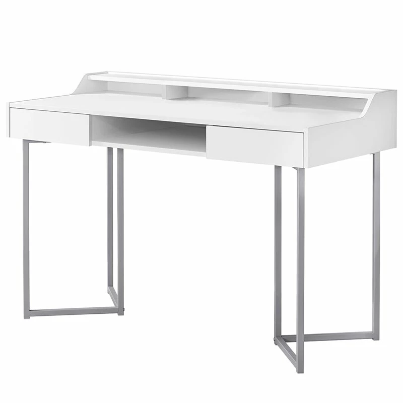 This modern style computer desk packs a lot of storage options in one sleek compact design. The spacious table top, made from durable MDF material, is finished in a chic white on all sides with ample room for a laptop, lamp, office supplies along with three open cubbies and a top shelf for your easy to reach essentials. There are two seamless storage drawers with a push-in mechanism and an open concept shelf in the middle to store a tablet, books, or magazines. The desk finishes off with bold angular silver metal legs for a light contemporary feel. Place this space saving desk in any room for instant style with maximum functionality! Assembly is required.