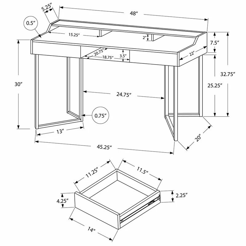 - Smooth spacious desk top in a chic white finish for a laptop, lamp, and writing essentials