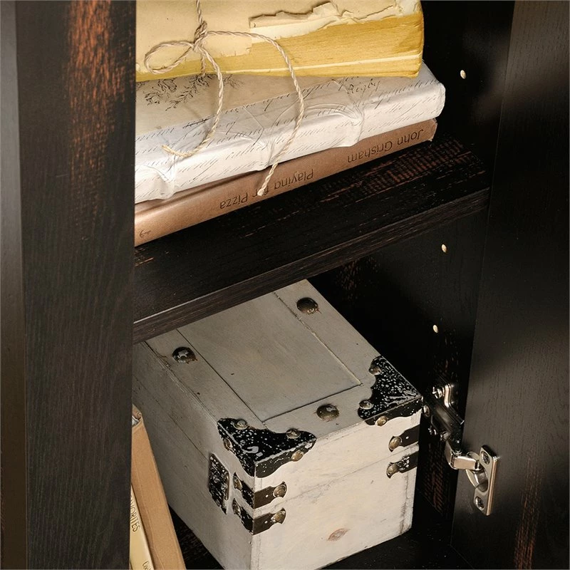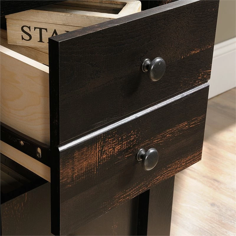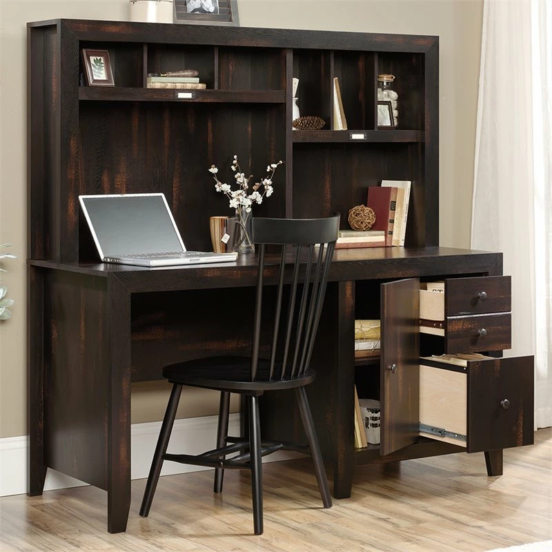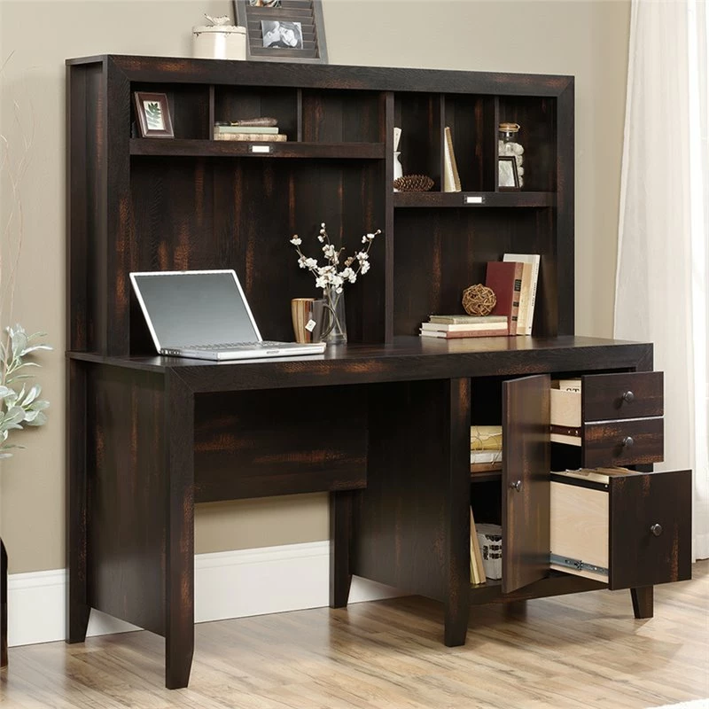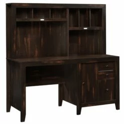 Transform your room into a rustic office with this Pemberly Row computer desk with hutch from the collection. Its spacious tabletop provides you with ample room for your laptop, printer, papers and more! It features two easy gliding drawers, cord management, ID label tags, and a storage area behind the door for a vertical CPU tower. The lower drawer features full extension slides to hold letter-size hanging files. Need more storage? The organizer hutch has convenient cubbyhole and vertical storage for various home and office supplies. Finished in Char Pine, this stylish desk will have you feeling organized and ready to get at it!