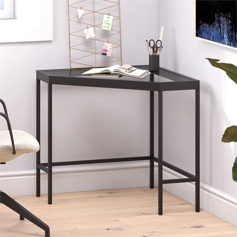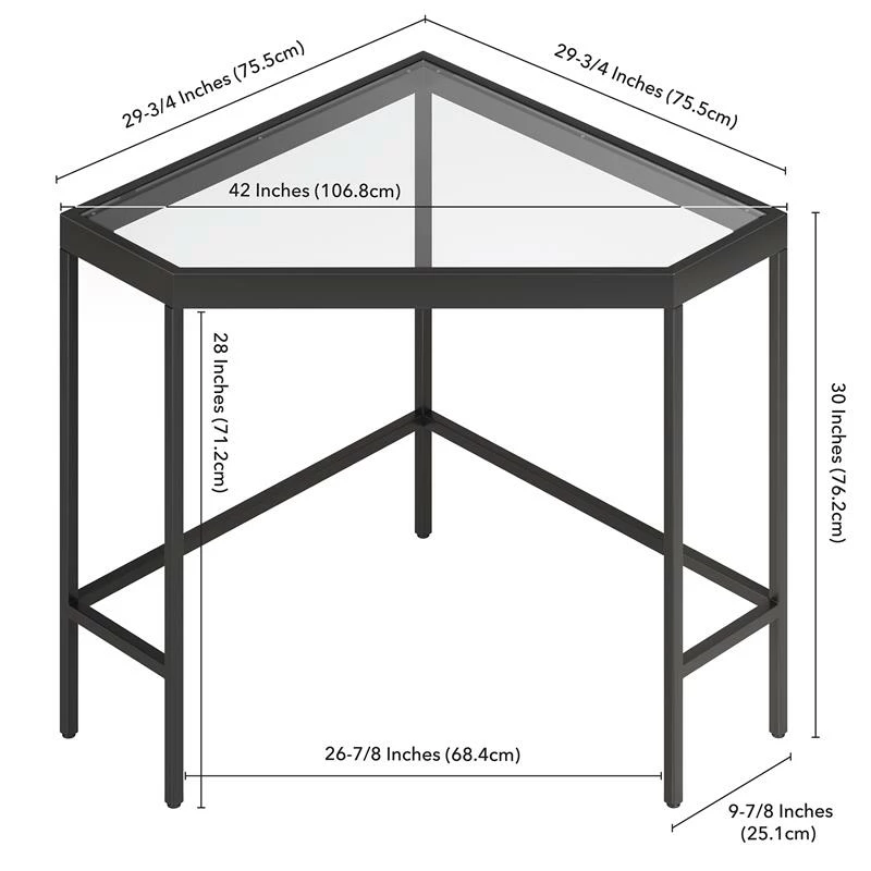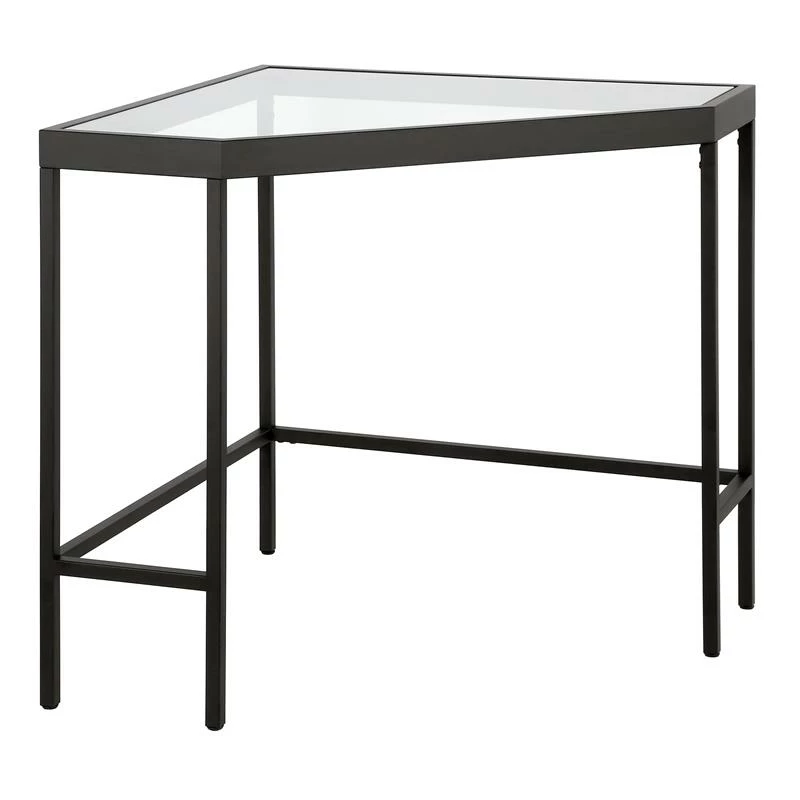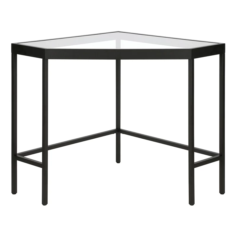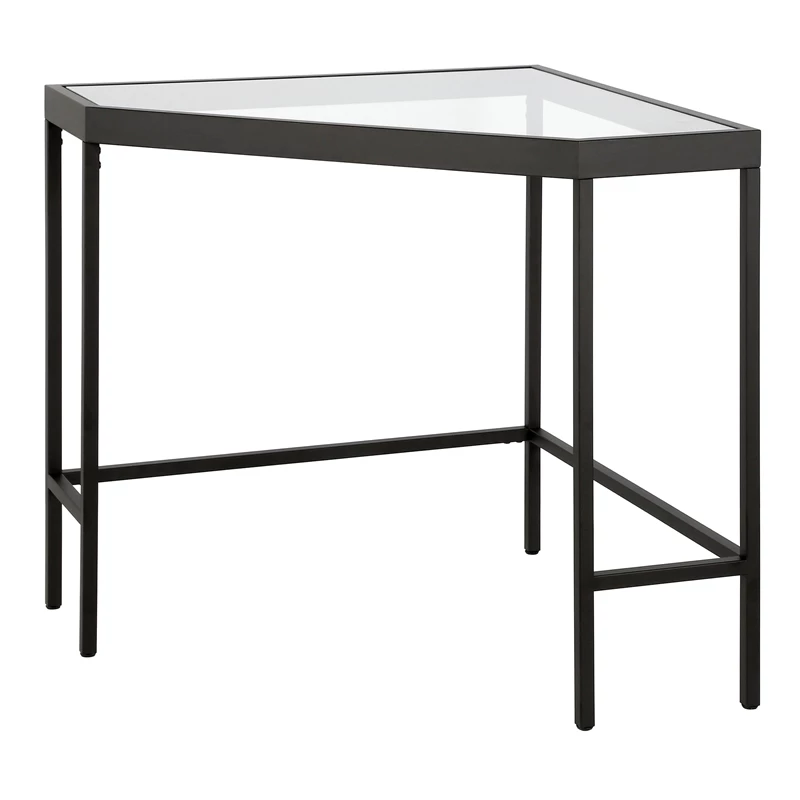 Work from home in style with the streamlined modern look of this minimalist desk. The sleek lines of its steel frame are offset by a sturdy tempered glass top, allowing you to personalize your workspace against a clean backdrop. Its open lower space provides plenty of room to settle in and take on the day. The unique shape is perfect for corners and compact spaces.