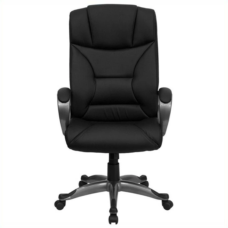 Whether you work from home or go into the office, this plush LeatherSoft upholstered executive office chair has a sleek, upscale look to show off your modern taste and style. LeatherSoft is leather and polyurethane for added softness and durability. This chair features generous padding on the seat, back and arms to provide comfort throughout the day. Having the support of an ergonomic office chair may help promote good posture and reduce future back problems or pain. High back office chairs extend to the upper back for greater support. The high back design relieves tension in the lower back, preventing long term strain. The waterfall front seat edge removes pressure from the lower legs and improves circulation. The tilt lock mechanism rocks/tilts the chair and locks in an upright position while the tilt tension adjustment knob adjusts the chair’s backward tilt resistance. Chair easily swivels 360 degrees to get the maximum use of your workspace without strain. The pneumatic adjustment lever will allow you to easily adjust the seat to your desired height. The titanium nylon base with black caps prevents feet from slipping when resting on chairs base. Take this executive office chair for a test drive, it won’t disappoint.