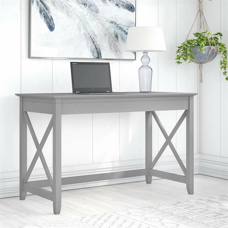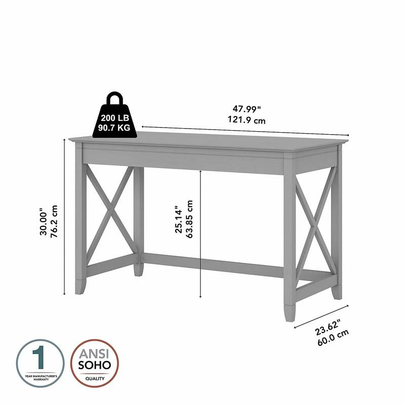Take on your daily tasks from the comfort of a spacious personal work area, even in small office environments. The Pemberly Row 48W Writing Desk offers more than enough room to spread out with a laptop and paperwork as you surf the web, pay bills or check the mail. Featuring side panels with unique X pattern accents, this office desk creates a relaxed and airy style supported by a sturdy and attractive post leg design. The durable work surface has a weight capacity of 200 pounds so you can confidently keep books and other work materials close by. Measuring 48W x 24D x 30H, the Writing Desk is perfect for use as a sofa table, console table or personal work area and is finished on all sides to look great facing any direction. This small computer desk is tested to meet ANSI/SOHO quality standards for safety.